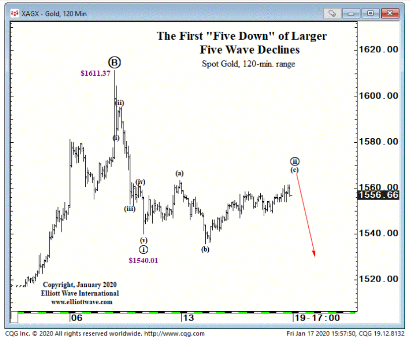 Bạn có thể nhìn thấy điều đó trên cấu trúc sóng Elliott dài hạn của vàng. Theo đó, sóng B (vòng tròn) đã kết thúc và chuyển sang sóng C (vòng tròn) giảm giá dài hạn.