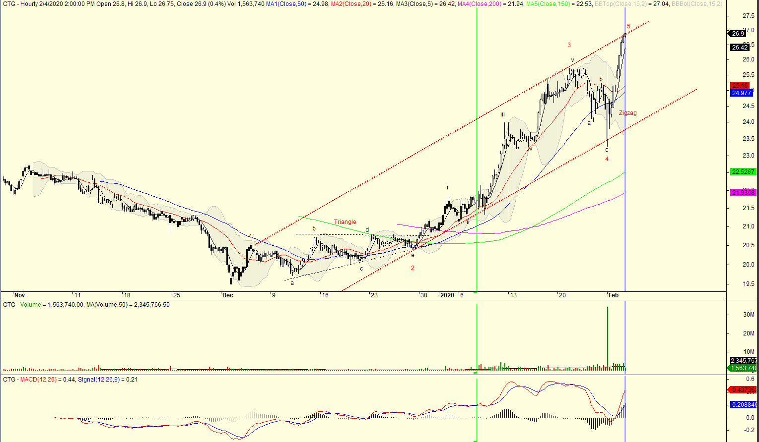 Đồ thị phân tích sóng Elliott trên khung thời gian H1 của CTG. Sóng 2 có dạng cấu trúc triangle (tam giác). Sóng 4 có dạng cấu trúc zigzag. Toàn bộ sóng đẩy hiện nay đang nằm trong một kênh giá (màu đỏ). Hiện sóng 5 đang chạm vào đường trên của kênh giá. Trong một số trường hợp, hiện tượng blow off xuất hiện và giá vượt qua đường kênh trên, sau đó quay trở lại đóng cửa dưới đường kênh trên.