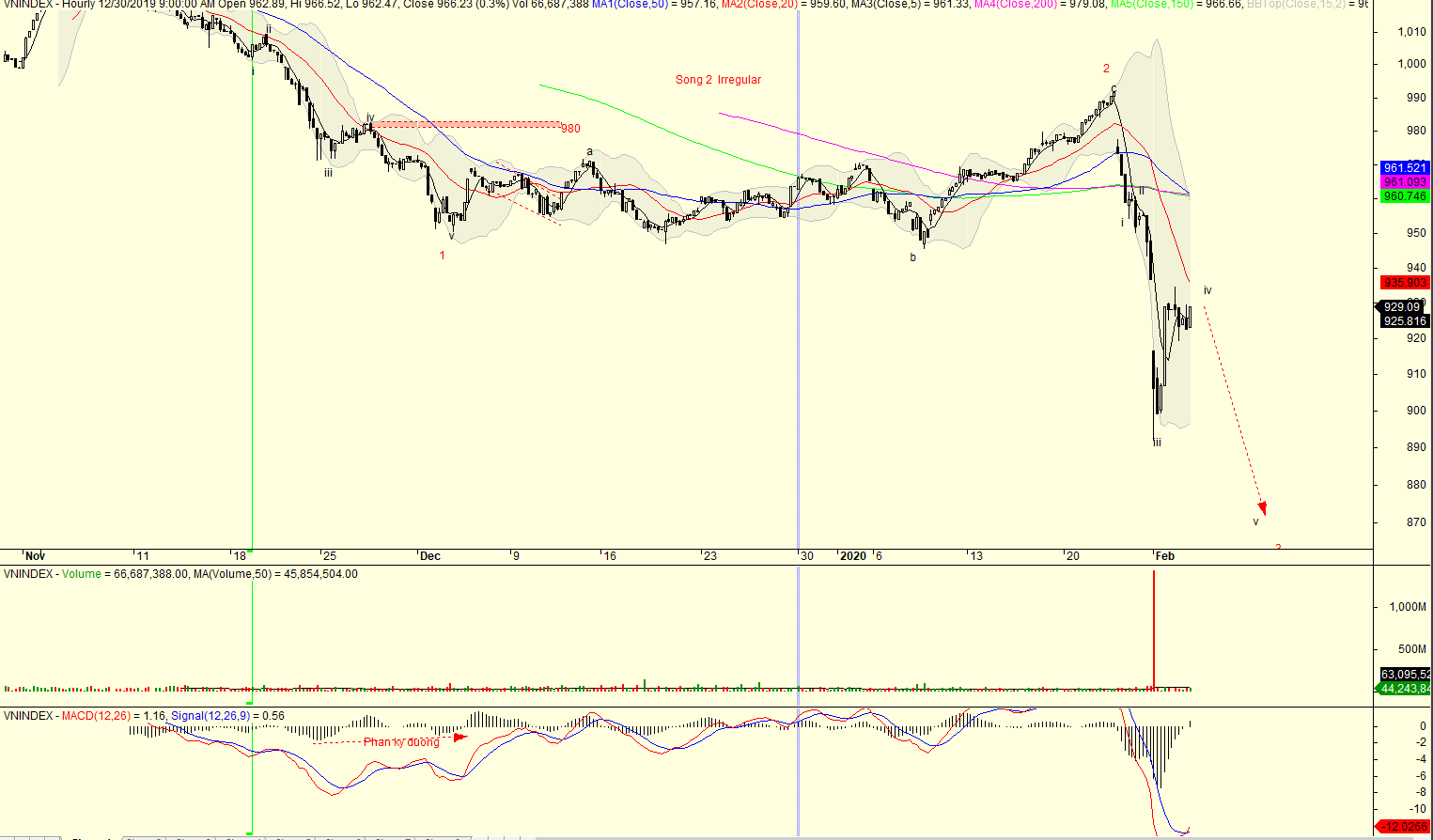 Chỉ số VN-Index đang ở trong sóng hồi iv của sóng 3. Sóng iv là dạng sóng phức tạp và cần thời gian để hình thành. Hiện chưa đủ thông tin để dự báo cấu trúc iv diễn ra như thế nào. Tuy nhiên có một khoảng trống tăng giá khi phá đáy đỉnh sóng 1. Đó là dấu hiệu của sóng 3 đang hình thành.