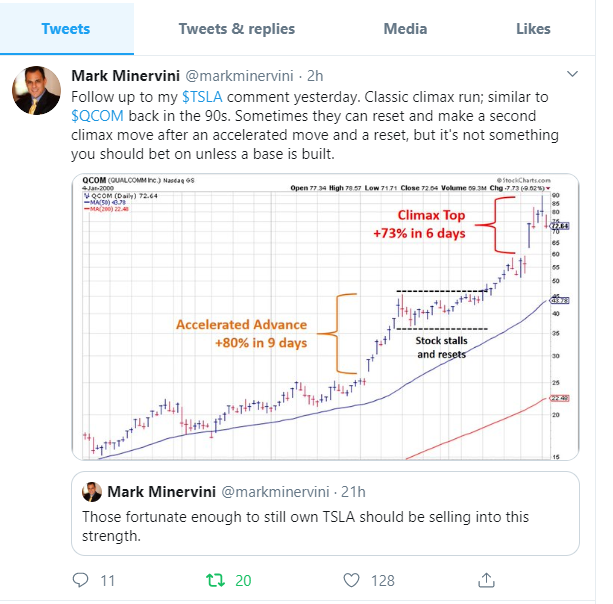 Cổ phiếu TSLA, theo đánh giá của phù thủy Mark Minervini đang tăng giá theo kiểu cao trào (climax) và là cơ hội bán khi cổ phiếu còn đang tăng giá.