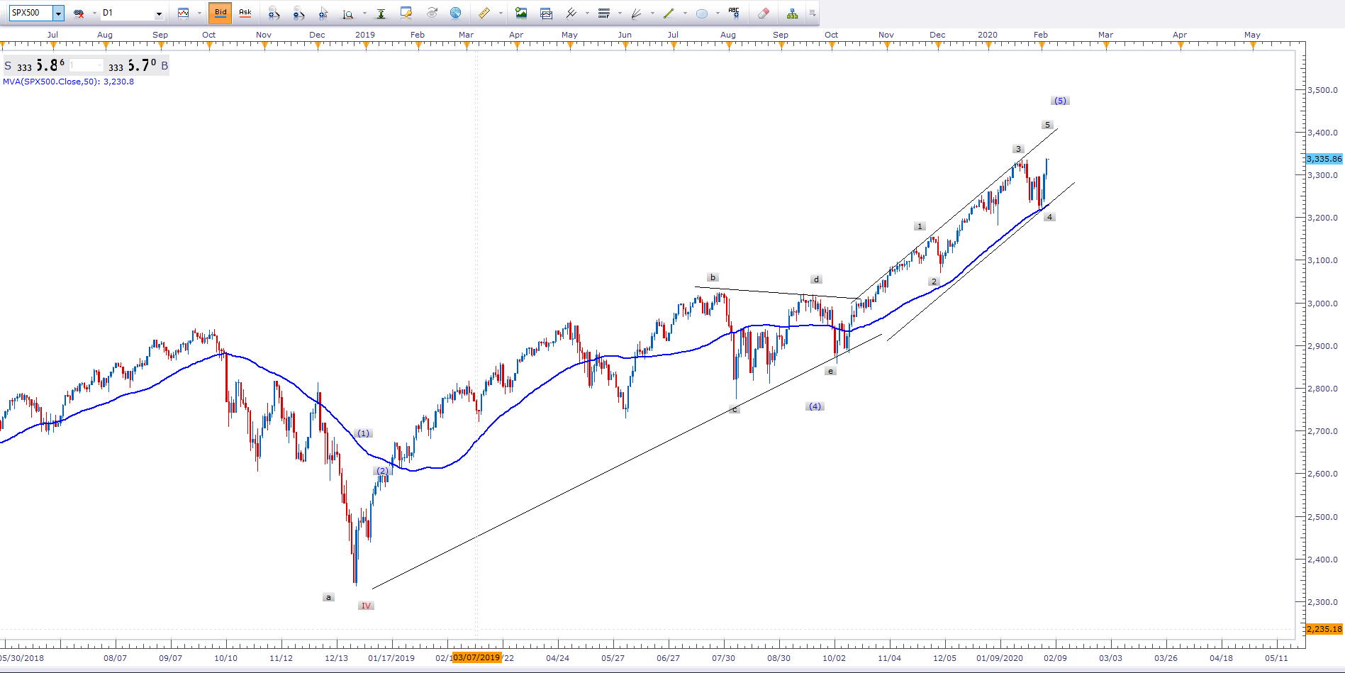 Mô hình sóng Elliott giải thích cấu trúc xu hướng tăng giá hiện nay như thế nào. Chỉ số SP500 bật dậy từ MA50, là đường phòng thủ của các nhà đầu tư tổ chức, tạm gác qua nỗi lo virus Corona để thiết lập đỉnh cao mới. Điều này được giải thích bởi đáy sóng 4 và đang tăng giá theo sóng 5 trong sóng (5). Cấu trúc tăng giá này đang diễn ra trong một kênh giá song song. Chú ý, sự kháng cự tạo ra bởi đường xu hướng trên.