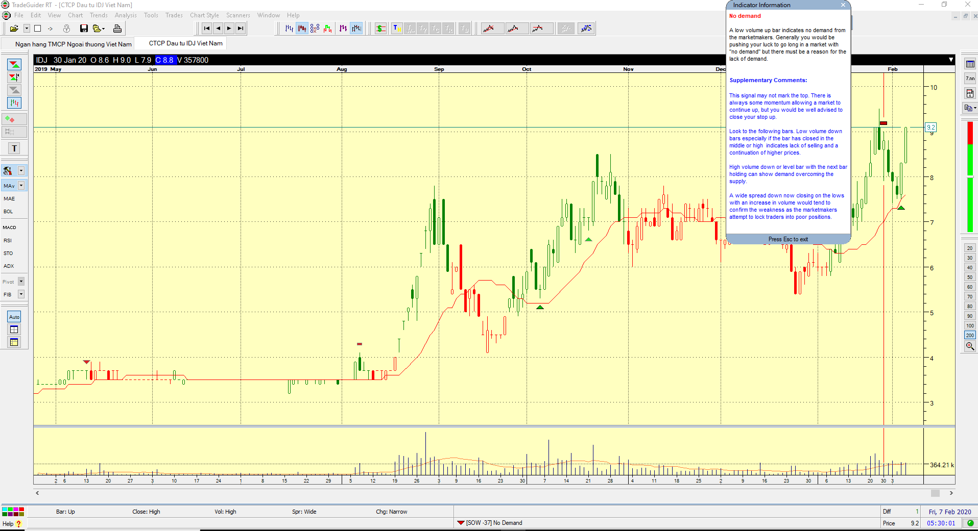 Ngày 30/1/2020, IDJ có một No Demand khi thanh giá tăng này có khối lượng thấp hơn hai phiên trước. Việc một No Supply xuất hiện ngay sau một No Demand là điều hoàn toàn bình thường. Trong bối cảnh mạnh (xu hướng tăng), MA20 ngày đang tạo hỗ trợ tốt.