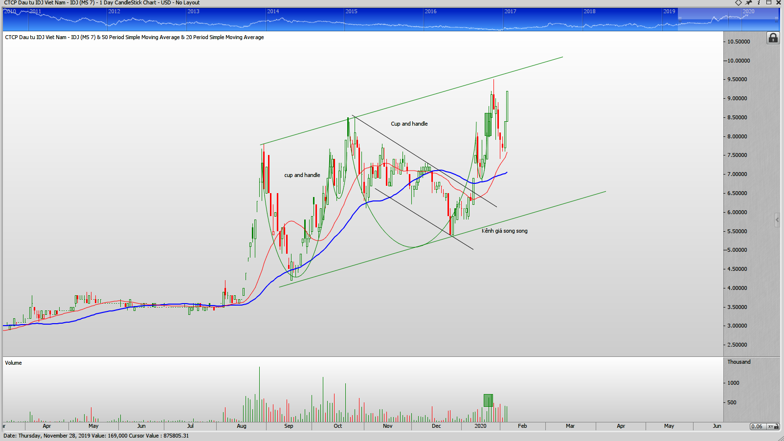 Quan sát mẫu hình của IDJ cho thấy, No Demand xuất hiên sau điểm breakout mẫu hình Cup and handle cho thấy đây là dấu hiệu của pullback. Giá kéo ngược về MA20 và xuất hiện No Supply để bảo vệ mẫu hình Cup and handle.