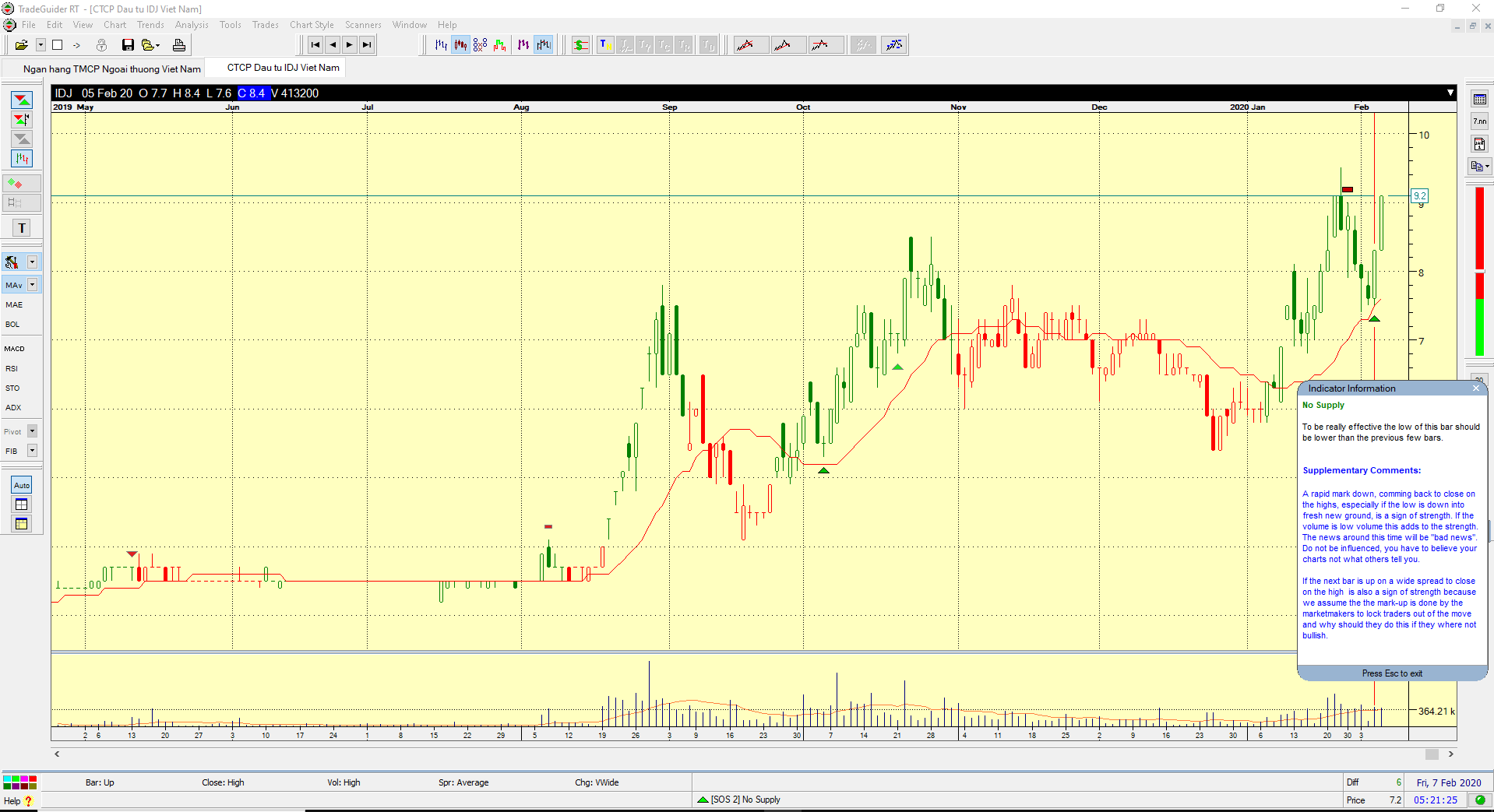 Ngày 4/2/2020, IDJ có mẫu hình No Supply, khi giá giảm với khối lượng thấp hơn so với hai thanh giá trước đó. Thanh giá giảm này có bóng nến ở phía dưới chứ không phải đóng cửa tại đáy thấp nhất ngày. No Supply này đang xuất hiện trong Uptrend, với hỗ trợ tại MA20 ngày.