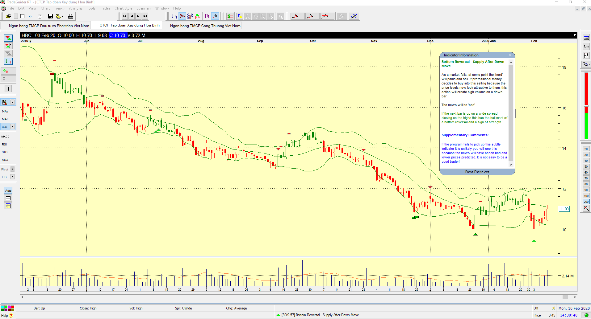 Hai thanh giá ngày 2/2/2020 và 3/2/2020 tạo nên Bottom Reversal. Chú ý, đây là cú Double Bottom với đáy ngày 25/12/2019. Mẫu hình hai đáy có thể để xuất hiện với cổ phiếu HBC. Tuy nhiên, chưa có cú test nào sau đáy thứ hai. Nhà đầu tư cần kiên nhẫn chờ đợi cú test.