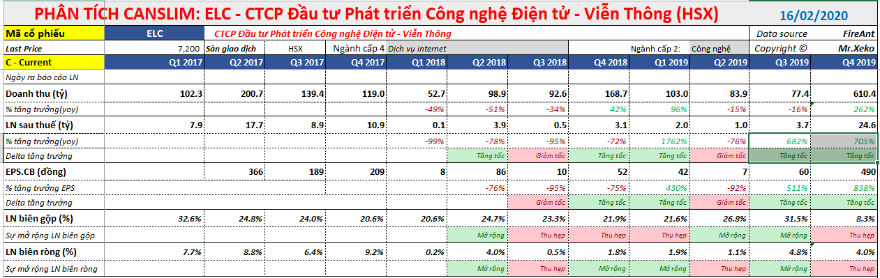 Phù thủy Mark Minervini rất chú ý đến các mã cổ phiếu đột biến lợi nhuận vì đó là điểm hút đối với các nhà đầu tư. Trong quý 3 và quý 4/2019, ELC có tốc độ tăng trưởng lợi nhuận sau thuế lần lượt là 682% và 705%. Trong đó, chú ý lợi nhuân quý 4.2019 là 24.6 tỷ đồng, là điểm breakout lợi nhuận so với các quý trước tính từ Q1/2017 đến nay.