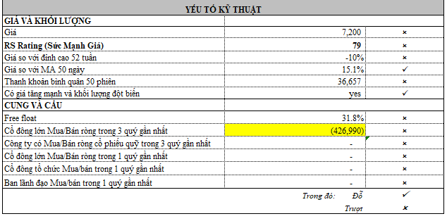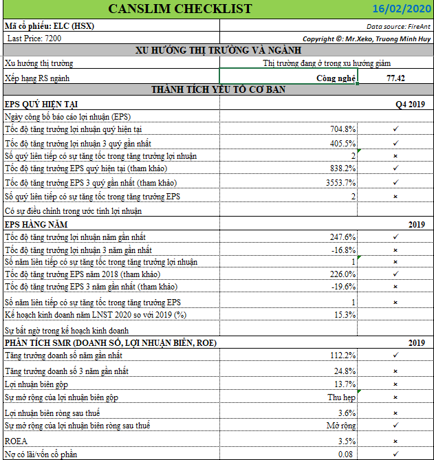 Bảng CANSLIM Checklist cho thấy, tốc độ tăng trưởng lợi nhuận năm 2019 là 247% và biên lợi nhuận ròng năm 2019 đã mở rộng trở lại. Cổ phiếu cô đặc với free float chỉ tầm 30%.