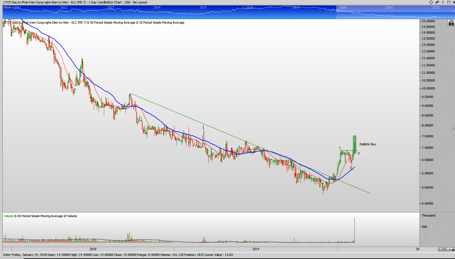 ELC có tín hiệu mua Dellphic Buy, một công cụ của Trend Trader. Mẫu hình của ELC là 1-2-3 Trading của Trader Vic.