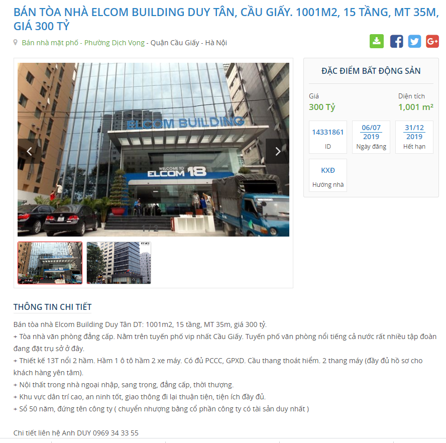 Tòa nhà Elcom thuộc quyền sở hữu của công ty. Chúng tôi chưa có dữ liệu để định giá tòa nhà này. Tuy nhiên, vào năm 2019, một trang tin bất động sản rao bán tòa nhà này với giá 300 tỷ đồng (xem nguồn). Hiện tại giá trị vốn hóa của công ty là 364 tỷ đồng.