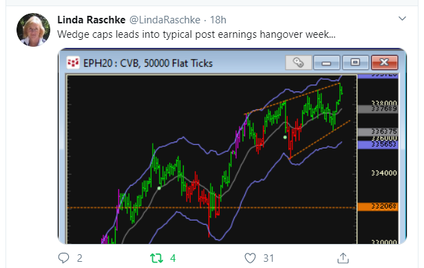 Tôi nhìn thấy SP500 xuất hiện sóng chéo (Diagonal) ở vị trí sóng 5. Một số phù thủy chứng khoán cũng trade theo mẫu hình này và gọi là cái nêm (wedge). Ví dụ như nữ phù thủy Linda Rasckke