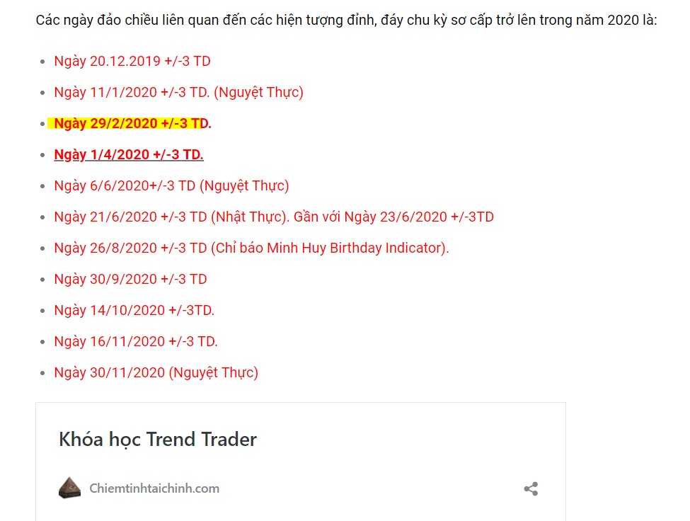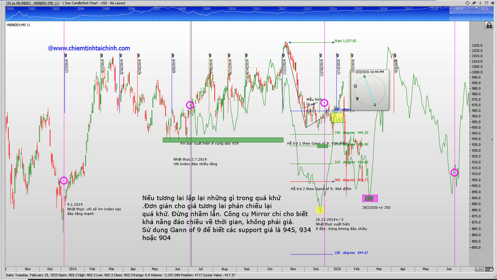 Trước hết, tôi quan sát mốc thời gian đảo chiều chiêm tinh sắp chạm tới, ngày 29/2/2020 +/-3 ngày giao dịch, vốn được công bố trong Triển Vọng THị Trường 2020 hồi đầu năm. Đây là midpoint của thời gian Mercury (Thủy Tinh) nghịch hành từ 16/2/2020 đến 9/3/2020. Tôi cũng chọn mốc thời gian này để khai giảng lớp Trend Trader.  (Tôi thường hay chọn các mốc thời gian đảo chiều để tiến hành các sự kiện)