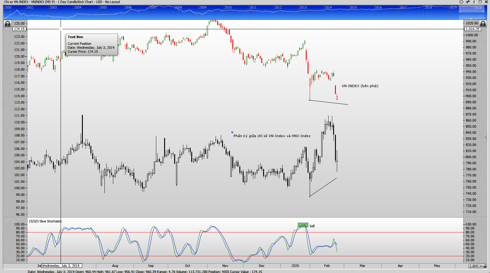 Tại các đáy chu kỳ sơ cấp, cả O’Neil và Raymond Merriman nhắc chúng ta nên tìm kiếm phân kỳ giữa các chỉ số. Sự phân kỳ chưa xảy ra nhưng tôi đang theo dõi kịch bản này cho VN-Index và HNX-Index.