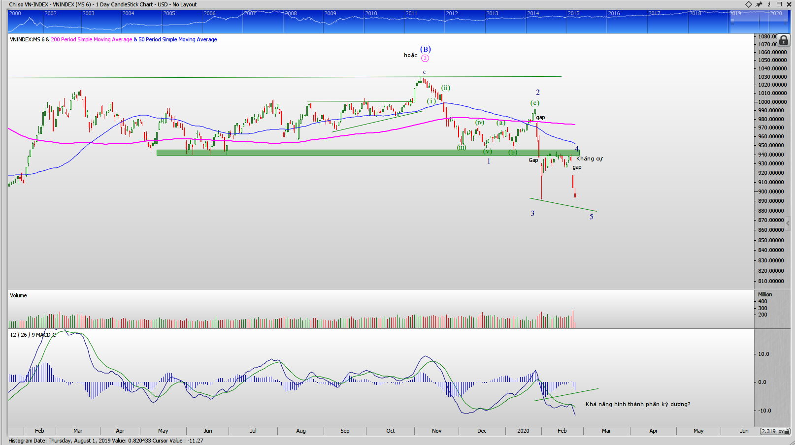 Mô hình sóng Elliott đang cho thấy khả năng kết thúc sóng 5. Chú ý tiềm năng tạo phân kỳ dương giữa giá và VN-Index. Các Gap xuất hiện liên tục và tiềm năng xuát hiện Exhaustion Gap.