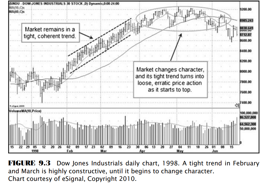 Khi thị trường tăng giá đến tháng 4 năm 1998, nó bắt đầu đều đặn tăng giá đi lên tạo nên một kênh giá chặt bắt đầu từ tháng 2 và xuyên suốt hết tháng 3. O’Neil xem đây là hành động giá tích cực. Ông nói “sự thắt chặt trong hành động giá của chỉ số thị trường trong khi xu hướng vẫn tăng là tích cực.” Hình 9.3 cho thấy xu hướng tăng được thắt chặt của chỉ số DJIA. Vấn đề quan trọng ở đây là sự thay đổi trong đăc điểm hành động giá, khi mà xu hướng tăng với giá thắt chặt bắt đầu chuyển sang biến động, rung lắc mạnh (choppy) và dần trở nên ít có xu hướng rõ rành (ND: là phần khoanh tròn trong Hình 9.3), là mang mối quan trọng cho thấy có điều đó “sai sai ở đây”. Thực sự, thị trường bắt đầu chao đảo vào mùa hè năm 1998, và mặc dù các chỉ số thị trường có thể tiếp tục thiết lập đỉnh mới vào giữa tháng 7 năm 1998, nhưng đây chính là bẫy tăng giá, và thị trường bắt đầu rớt nhanh khi chịu dư chấn từ cú sốc từ Cuộc Khủng Hoảng Đông Á năm 1997.
