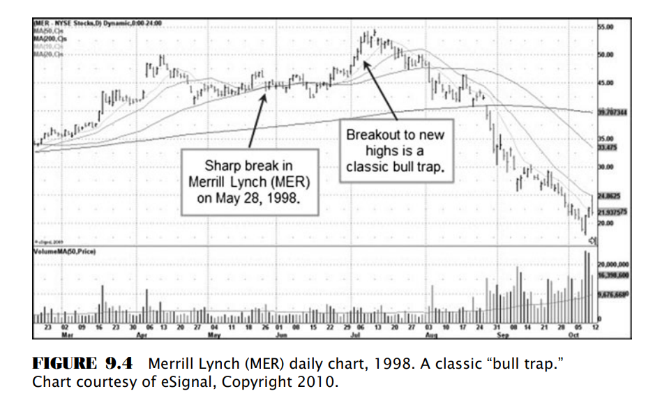 O’Neil có thể đánh hơi thấy có cái gì đó bất ổn rất nhanh. Vào ngày 27 tháng 5, ông ấy chỉ ra “Cổ phiếu các ngân hàng và công ty môi giới hiện đang gặp khó và không tăng giá. Cuộc khủng hoảng tài chính bắt đầu lan rộng. Có bằng chứng rõ ràng từ cuộc khủng hoảng Đông Á- không chỉ là có vài thông tin mà có rất nhiều thông tin cần lưu ý.” Các vấn đề khó khăn ở Philippines và Indonesia, cùng với một số quốc gia khác ở Châu Á đang tạo ra “nhịp tim hoảng loạn” trên thị trường, và hãy lưu ý cổ phiếu các công ty môi giới và ngân hàng đã giảm mạnh vào ngày 28 tháng 5, trong bối cảnh mà thị trường chung vẫn có xu hướng tăng giá chặt trong kênh giá từ tháng 2 đến tháng 3 (xem lại Hình 9.3) rồi bắt đầu loạng choạng khi thiết lập đỉnh cao mới. Merrill Lynch (MER), như minh họa trong Hình 9.4, có khoảng trống giảm giá mạnh vào ngày 28 tháng 5 nhưng sau đó không có bất cứ cú giảm giá mạnh nào khác, rồi hồi phục trở lại và thiết lập đỉnh cao mới vào đầu tháng 7. Tuy nhiên, nó đã bắt đầu bốc mùi, và chắc chắn O’Neil sẽ không thích điều này. Khi MER và các cổ phiếu tài chính khác như Lehman Brothers (LEH) và Morgan Stanley (MS) cố gắng thiết lập đỉnh cao mới vào đầu tháng 7 năm 1998, nhưng chúng đều thất bại và sau đó giảm rất mạnh tạo nên cú bẫy tăng giá điển hình. Lưu ý trên đồ thị của MER khi nó bắt đầu phá thủng đường MA 200 ngày vào cuối tháng 8. Các nhà đầu tư đã chứng kiến sự sụp đổ của cổ phiếu ngành tài chính vào tháng 3 năm 2008 có thể nhận ra sự tương đồng với cú sụt giảm năm 1998 của nhóm ngành tài chính