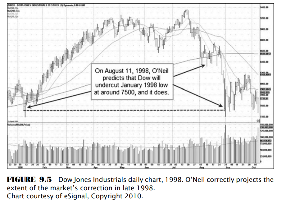 O’Neil luôn quan sát sự sụt giảm của thị trường và phỏng đoán độ lớn tiềm năng của nó dựa trên bối cảnh đồ thị dài hạn. Khi thị trường bắt đầu giảm mạnh vào cuối tháng 8 năm 1998, ông đã xác định một mục tiêu giảm giá tiềm năng, chính là phá thủng đáy đầu năm 1998 như Hình 9.5 minh họa. Đáy thấp nhất trong ngày của ngày đóng cửa thấp nhất tháng 1 năm 1998 là 7,500, vì thế O’Neil nhanh chóng kết luận rằng đây là vùng giá đầu tiên mà thị trường con gấu sẽ chạm đến và cố gắng tạo đáy ở đây. Giá phá thủng mức hỗ trợ lớn này sẽ rũ bỏ phần lớn các nhà đầu tư, là những người trông chờ giá sẽ tạo đáy tại vùng hỗ trợ này (ND: khi họ thấy vùng hỗ trợ không còn phát huy tác dụng họ sẽ vội vàng bán cổ phiếu hoặc thậm chí quay sang bán khống.” Và như tất cả chúng ta đều biết, khi đám đông chạy về một phía của thị trường, thì ngài thị trường sẽ chạy về một phía khác.