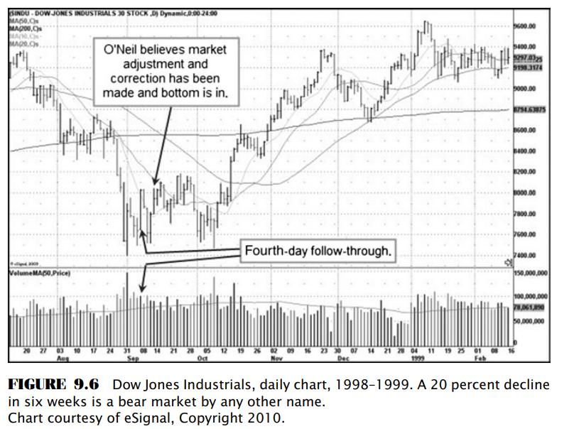 Dự báo của O’Neil đã hoàn toàn chính xác khi chỉ số Dow Jones phá thủng đáy 7,500 như minh họa trong Hình 9.6. Năm ngày sau kể từ đáy vào đầu tháng 9, thị trường bắt đầu thiết lập ngày bùng nổ theo đà, nhưng O’Neil cảm thấy rằng nó vẫn còn quá sớm sau 6 tuần giảm giá. Tuy nhiên, ông nhận thấy sự điều chỉnh hiện tại chắc chắn đã kết thúc khi ông đưa ra đánh giá: “Một cú giảm mạnh hơn 20% chỉ trong 6 tuần. Thị trường có thể mới chỉ có sóng hồi và chúng ta cần thêm thời gian để thị trường biến động đi ngang.” Mặc dù nhiều người tin rằng thị trường con gấu phải “tồn tại trong một khoảng thời gian nhất định” mới tạo nên một thị trường con gấu đúng nghĩa, nhưng O’Neil hiểu rằng một cú giảm giá với độ lớn mạnh và vận tốc nhanh như thế là rất hiếm và nó đủ để loại bỏ những kẻ bán cuối cùng ra khỏi thị trường và dễ dàng tạo ra một thị trường con gấu giá trị.