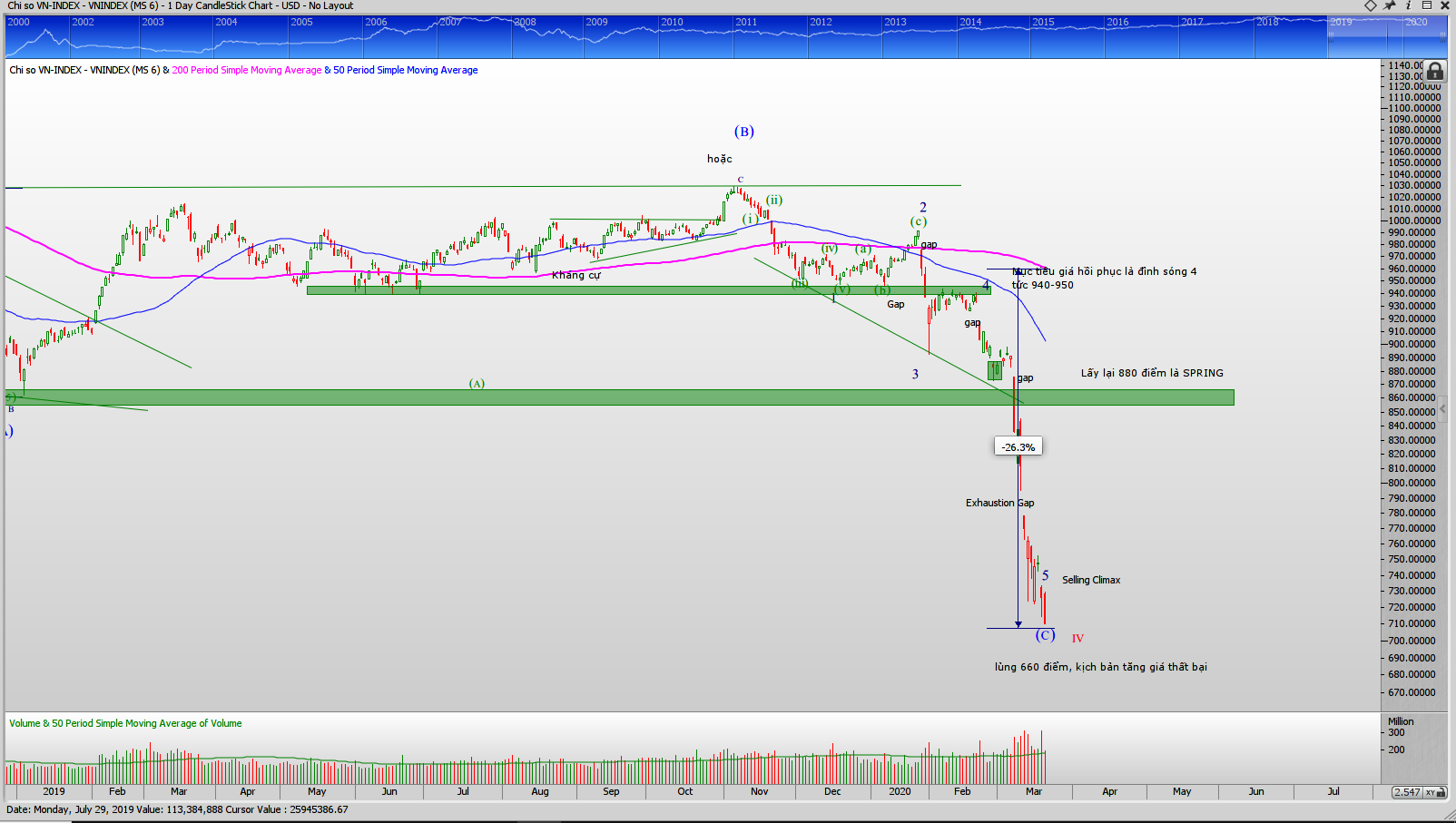 Trong mô hình sóng Elliott, chúng tôi duy trì kich bản tăng giá cho dài hạn nếu như mốc 660 điểm vẫn giữ vững. Có hai vùng support hiện nay là 705 điểm và 680 điểm.