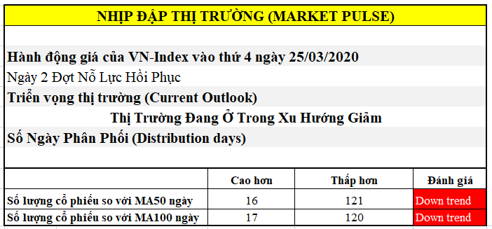 Sau những ngày tháng bĩ cực từ đầu năm, nhà đầu tư chứng khoán Việt Nam và thế giới có một phiên giao dịch ngập tràn niềm vui. Các chỉ số chứng khoán Mỹ tăng từ 8%-11% nhờ thông tin gói 2,000 tỷ được thông qua. Thị trường chứng khoán Việt Nam vì thế cũng có phiên tăng giá mạnh nhất từ đầu năm khi VN-Index tăng 4.71% với khối lượng thấp hơn ngày hôm qua. Bản tin Nhịp Đập Thị Trường dành cho TTCK Việt Nam ghi nhận “đây là ngày 2 của đợt nỗ lực hồi phục”. Chúng ta chờ đợi ngày Bùng Nổ Theo Đà, thường xuất hiện sau ngày 4 của đợt Nỗ Lực Hồi Phục, để đưa thị trường quay lại xu hướng tăng giá.