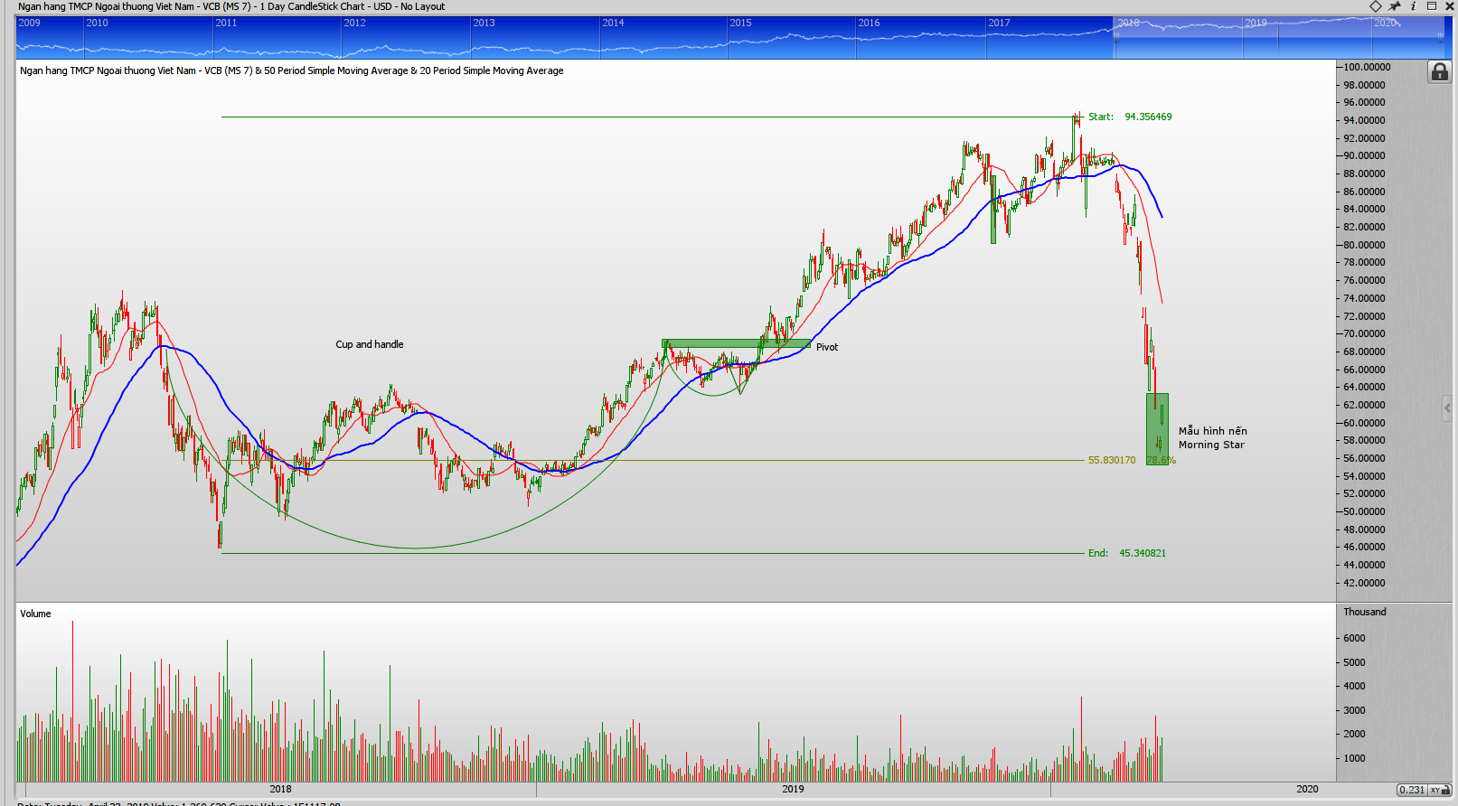 Tương tự như VN-Index, VCB cũng có mẫu hình Morning Stars. Cổ phiếu này đang tìm thấy điểm hỗ trợ tại Fibonaci 78.6%. Cổ phiếu này đang tiến sát vùng đáy của mẫu hình chiếc cốc-tay cầm trước đó.