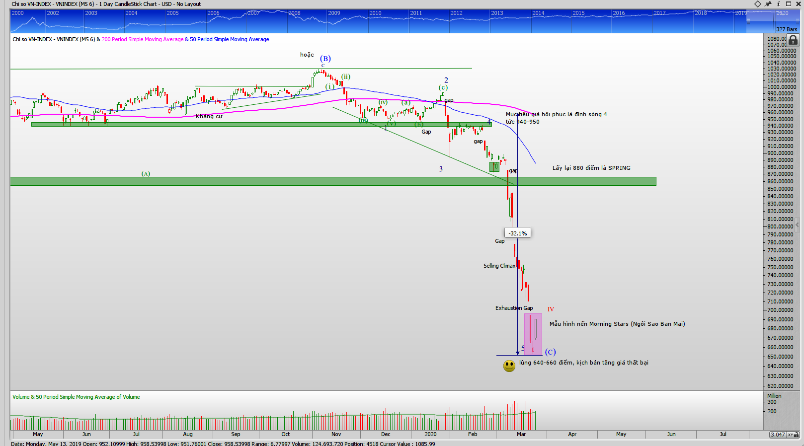 Trên đồ thị giá, mẫu hình nến đảo chiều Morning Stars (Ngôi Sao Ban Mai xuất hiện). Như vậy, đúng như kỳ vọng, tôi nhìn thấy khả năng đảo chiều quanh thời điểm 1.4.2020. Chỉ số VN-Index đang đối diện với Exhaustion Gap của phiên trước đó. Nếu như VN-Index có ngày Bùng Nổ Theo Đà, nó cần phải lấp khoảng trống này lại. Ngược lại, việc VN-Index giảm trở lại, phá đáy hiện tại và lủng luôn mốc 640 điểm, chúng tôi cảnh báo các xu hướng giảm giá dài hạn chưa dừng lại.