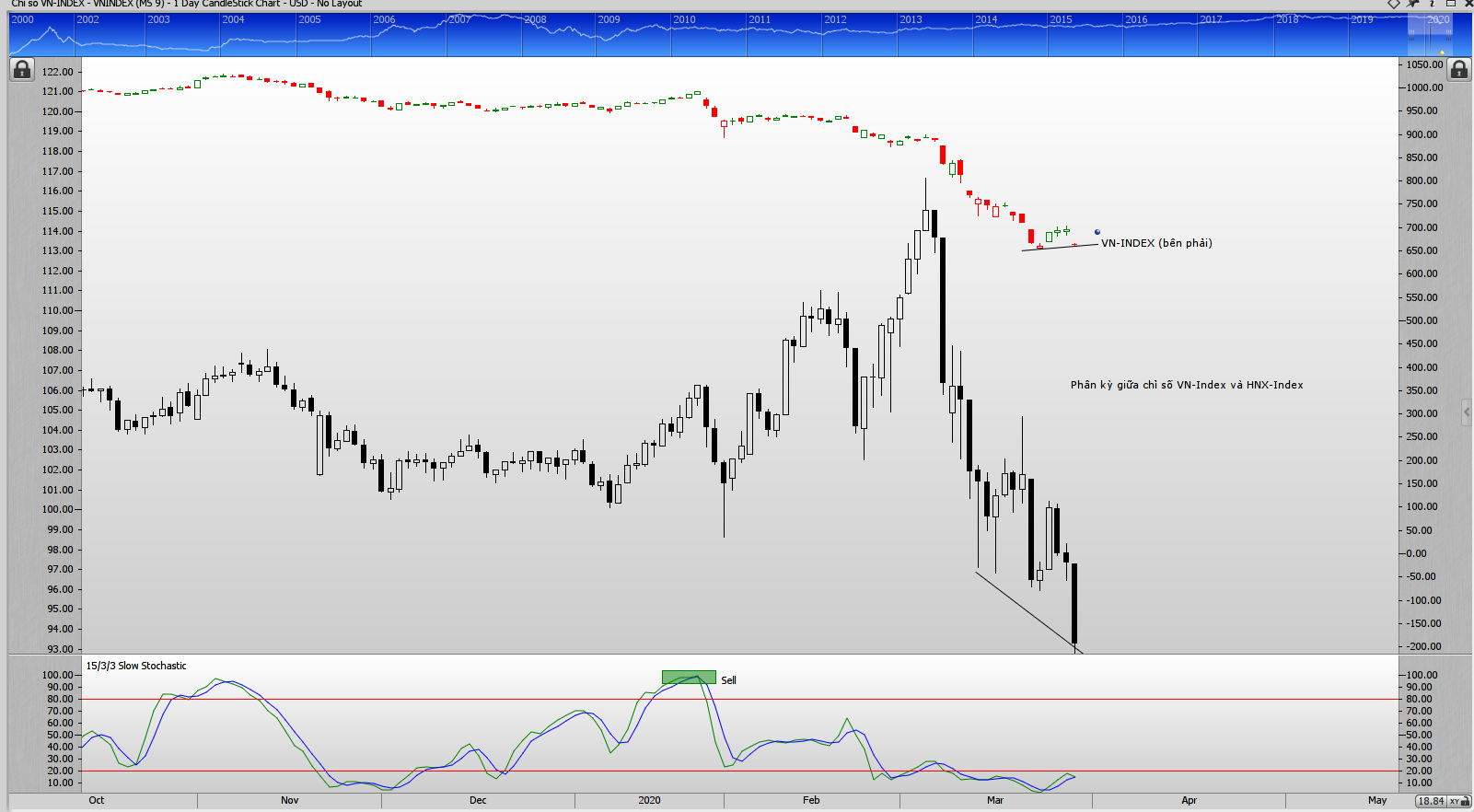 Theo góc nhìn CANSLIM, thì đây là phiên nỗ lực hồi phục số 5 trên sàn Hose. Thường các Ngày Bùng Nổ Theo Đà hay xuất hiện ở ngày 4 đến ngày 7 Nỗ Lực Hồi Phục. Đôi khi xuất hiện muộn hơn ở Ngày 10. Chúng ta cần có sự xuất hiện của ngày Bùng Nổ Theo Đà để quay trở lại uptrend. Trong khi đó, sàn Hà Nội đã tạo đáy mới và bắt đầu đếm lại từ đầu ngày Nổ Lực Hồi Phục. Tuy nhiên, chú ý chúng ta đang có sự phân kỳ giữa các chỉ số. Điều O’Neil xem là một trong những dấu hiệu tạo đáy.