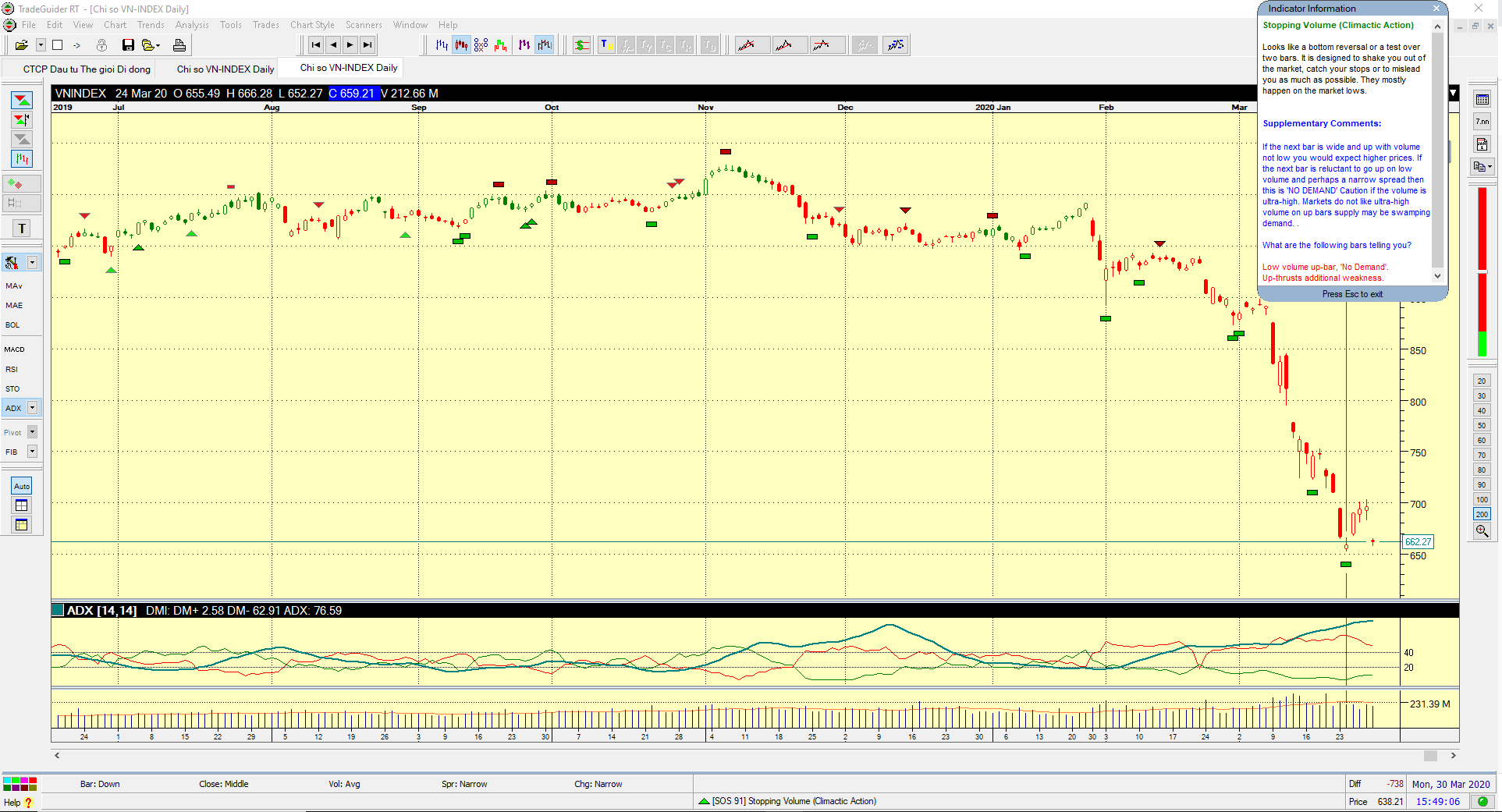 Phiên giao dịch ngày 30/3/2020 có thể xem là một phiên Test cung thành công với spread hẹp, khối lượng thấp và giá đóng cửa nằm ở nửa trên spread. Trước đó, ngày 24/3 và 25/3 có Stopping Volume. Các phiên sau tăng giá v xác nhận tín hiệu tăng giá nhưng do khối lượng thấp, spread hẹp dần nên lực yếu tạo nên bull trap. Điều này hoàn toàn đúng với những gì các nhà phân tích VSA mong đợi ở Stopping Volume. Chỉ báo Stopping volume giúp các nhà giao dịch nhận biết lực cầu đang xuất hiện nhưng lực bán vẫn còn. Thị trường sẽ không tăng giá nhanh cho đến khi các nhà giao dịch chuyên nghiệp kiểm tra lực cung đã biến mất hay chưa. Họ sẽ làm điều này bằng các cú shakeout (rũ bỏ) hoặc test (kiểm tra). Cú test nên xảy ra ở vùng giá của Stopping Volume.