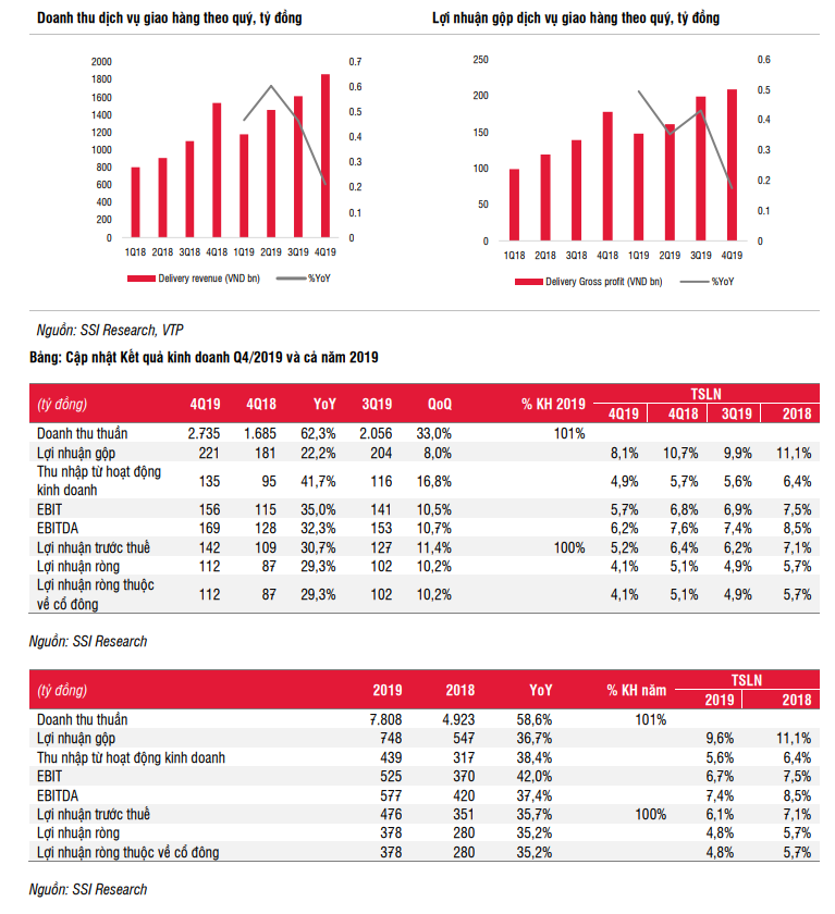 - Nhìn lại hoạt động kinh doanh 2019, VTP vẫn có một năm thành công với tăng trưởng doanh số đạt 59%, cao nhất trong 4 năm trở lại đây. Trong khi đó, lợi nhuận đạt mức 36% vì biên lợi nhuận giảm sút. Chúng tôi cho rằng, nguyên nhân khiến cho biên lợi nhuận của VTP giảm vì đang ở giai đoạn đầu phát triển Voso, Mygo (chi phí marketing) và phát triển nguồn nhân lực cho bộ phận giao nhận. Theo SSI, VTP đã phải tăng lương để để giữ chân nhân viên và tác động từ việc chuyển đổi mô hình giao hàng chặng cuối (Từ sử dụng nhân viên VTP sang thuê tài chính Mygo để giao hàng nội thành nên các nhân viên bán thời gian trước đây trở thành nhân viên chính thức và trả lương cao hơn)“. Quý 4.2019, thời điểm tung ra Voso và Mygo, biên lợi nhuận quý 4 cũng giảm mạnh. Tăng trưởng doanh số trong quý 4.2019 cũng chỉ ở mức 20%, thấp nhất trong nhiều năm. (Phía SSI cho rằng, đây là nguyên nhân khiến giá cổ phiếu VTP giảm trong quý 4).