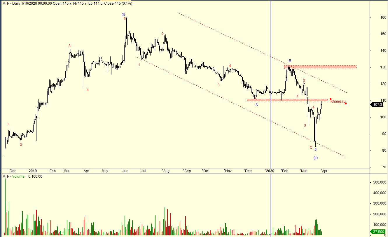 Trong mô hình sóng ELliott, VTP đã hoàn tất cấu trúc sóng hiệu chỉnh Zigzag (dạng A-B-C). Tuy nhiên, sự hồi phục hiện nay đang bị kháng cự bởi đáy sóng A. Sẽ còn mất rất lâu nữa cổ phiếu này mới xây xong nền giá. Trước mắt, nếu vượt được kháng cụ 110 thì vùng giá mục tiêu là 130 (kháng cự tại điểm B).
