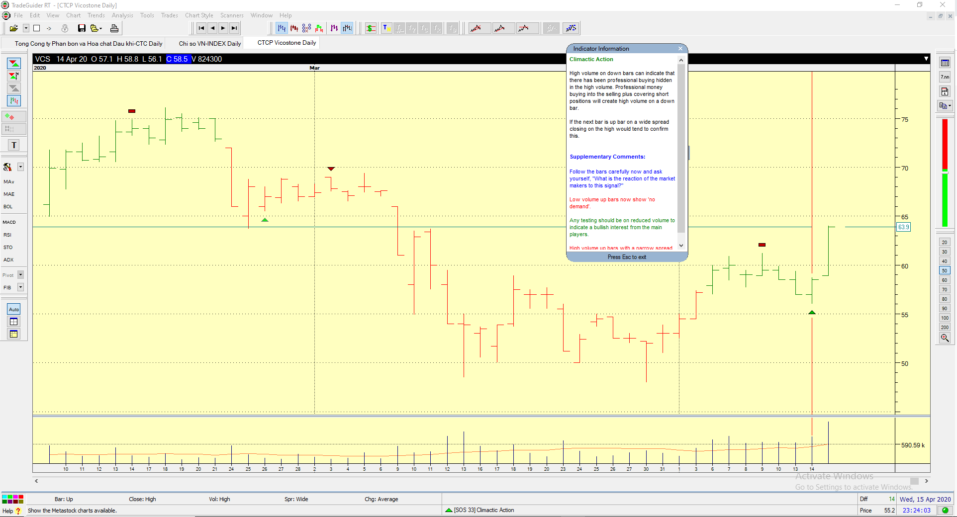 VCS là cái tên mới xuất hiện. Phiên ngày 14/4, VCS có hành động giá “Climatic Action” là thanh giá có khối lượng cao, giá giảm đầu phiên nhưng cuối phiên tăng giá, đóng cửa ngay tại đỉnh cao nhất ngày, với spread hẹp. Phiên ngày 15/4/2020, là phiên tăng giá mạnh xác nhận lực tăng của Climactic Action. Đồng thời, đây cũng là ngày có điểm mua Pocket Pivot.