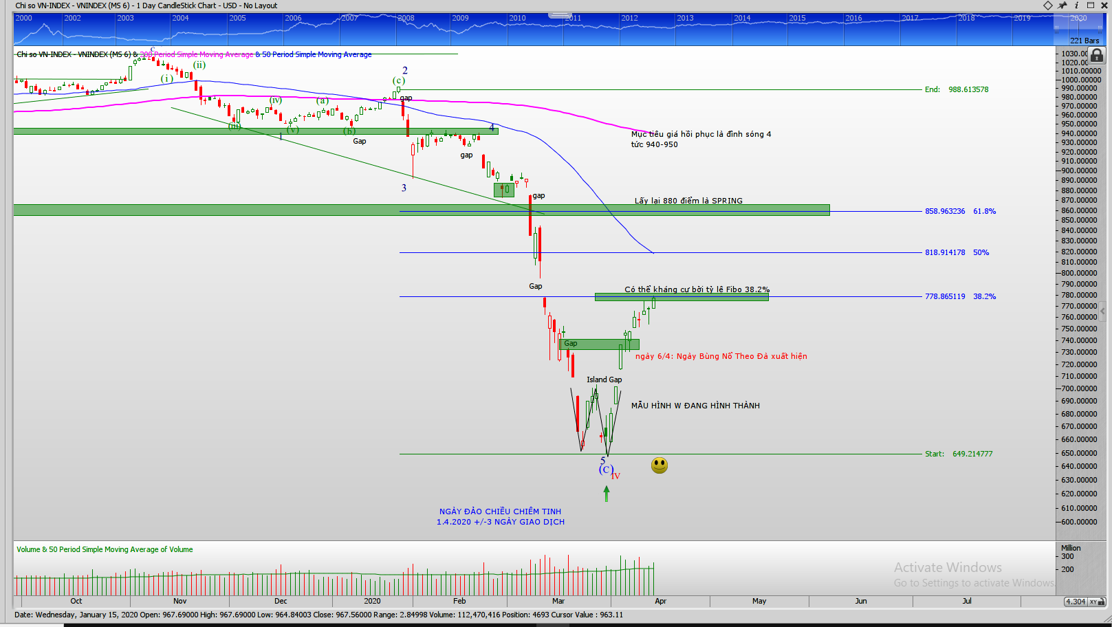 Chỉ số VN-Index đang tiến gần đến khoảng trống tăng giá (Gap) và tỷ lệ FIbonacci 38.2%. Đó là một vùng kháng cự. Tuy nhiên, chúng tôi đang nghĩ tới kịch bản VN-Index sẽ tiếp tục bứt phá qua vùng kháng cự này. Nên nhớ, chúng tôi cần xác định xu hướng uptrend theo quan điểm chu kỳ là giá phải cắt lên MA50 ngày. Hiện nay đường MA50 ngày đang kéo về 818 điểm (và có xu hướng dốc xuống). Việc giá cắt lên MA50 ngày xác nhận đáy ngày 1/4/2020 là đáy PB (Chu kỳ sơ cấp) hoặc cao hơn nữa (thậm chí có thể đáy chu kỳ 50 tuần). Chúng tôi cũng nhìn thấy vào 24/4 +-3 ngày giao dich mới là vùng rung lắc về đảo chiều chiêm tinh.