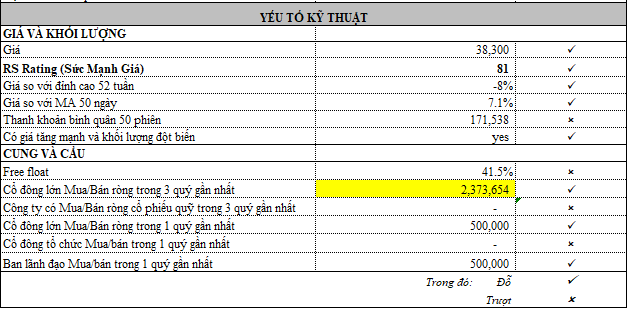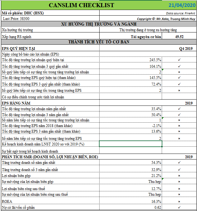 Kiểm tra bảng CANSLIM Checklist cho thấy, công ty có đột biến lợi nhuận trong quý 4/2019. Thời điểm này báo cáo tài chính quý 1/2020 chuẩn bị công bố. Công ty có ROE=16.4%, Tỷ lệ Nợ có lãi/vốn cổ phần là 0.62. RS (Sức mạnh giá) bằng 81. Cổ đông lớn mua ròng 500,000 cổ phiếu (Chủ tịch HĐQT mua) trong vòng 1 quý gần nhất.