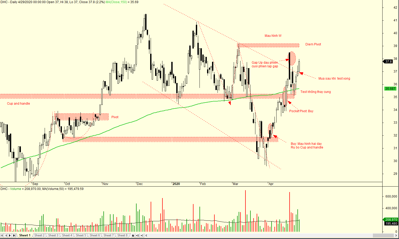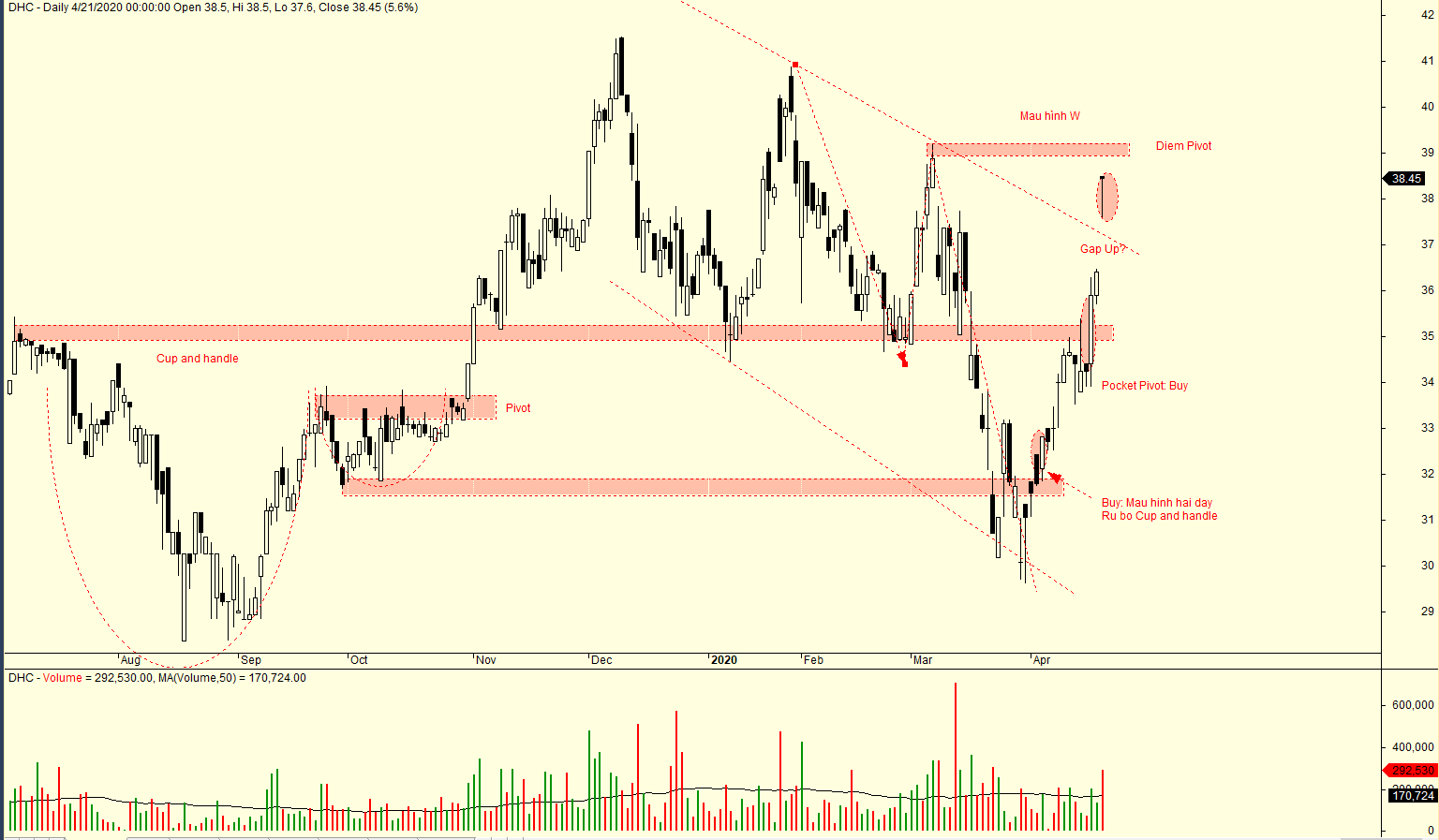 Trên đây là dòng định nghĩa về cổ phiếu dẫn dắt mà tôi muốn bạn đọc xem lại. DHC chỉ giảm 27% trong đợt bán tháo do Covid, thấp hơn so với mặt bằng chung và trong khi chính thị trường chung cũng đã giảm 36% kể tư đỉnh tháng 11/2019. Chỉ có cổ phiếu dẫn dắt mới làm như thế. Trong khi thị trường hồi phục khá mạnh trong thời gian qua nhưng con cách rất xa đỉnh 52 tuần thì DHC đã nhanh chóng tiến sát đỉnh 52 tuần. Hiện cổ phiếu này chỉ còn cách đỉnh 52 tuần vỏn vẹn -7%, và tiến sát tới điểm pivot của mẫu hình W trong trường phái CANSLIM. Điểm pivot là 39.3
