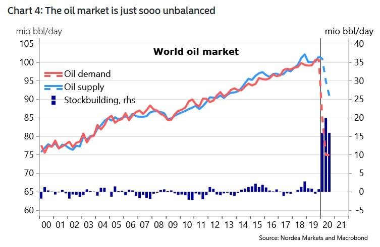 Lý do: “Paul Sankey ước tính tình trạng dư cung khoảng 15 triệu thùng/ngày. Điều này sẽ khiến giá dầu về vùng âm khi các thùng dầu của Nga và Ả Rập Xê Út tham gia thị trường. Theo Sankey, các kho chứa của Mỹ đã đầy 50%, và chỉ có thể chứa thêm được 135 triệu thùng. Với giả định tốc độ lưu kho là 2 triệu thùng/ngày, Mỹ có thể bổ sung 14 triệu thùng/tuần vào kho chứa. Như vậy, chỉ trong 10 tuần nữa, kho chứa của Mỹ sẽ đầy.”
