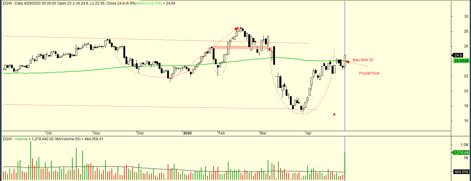Cổ phiếu DGW (dòng công nghệ) xuất hiện điểm mua Pocket Pivot, và theo dõi sự hình hành của mẫu hình 3C của phù thủy Mark Minervini