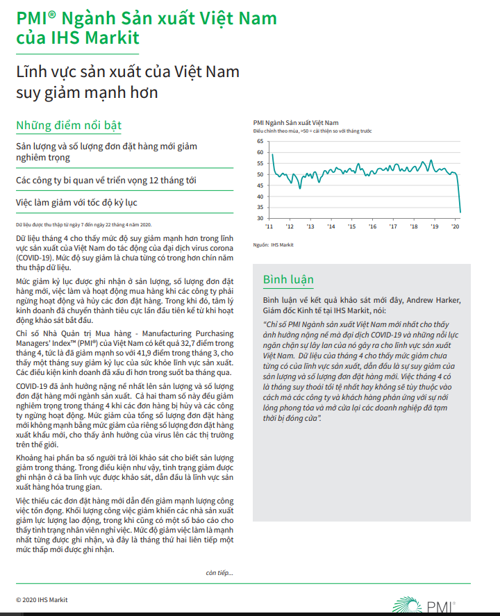 Hôm nay dữ liệu PMI sản xuất tháng 4 được công bố. Không ngoài dự đoán, chỉ số PMI của phần lớn các quốc gia Đông Nám Á đều giảm mạnh, trong đó Indonesia giảm mạnh nhất. PMI của Việt Nam giảm xuống còn 32.7. Chi tiết, sản lưởng và số lượng đơn đặt hàng mới giảm nghiêm trọng và việc làm giảm với tốc độ kỷ lục. Dữ liệu tháng 4 cho thấy Việt Nam chịu ảnh hưởng mạnh của Covid-19.