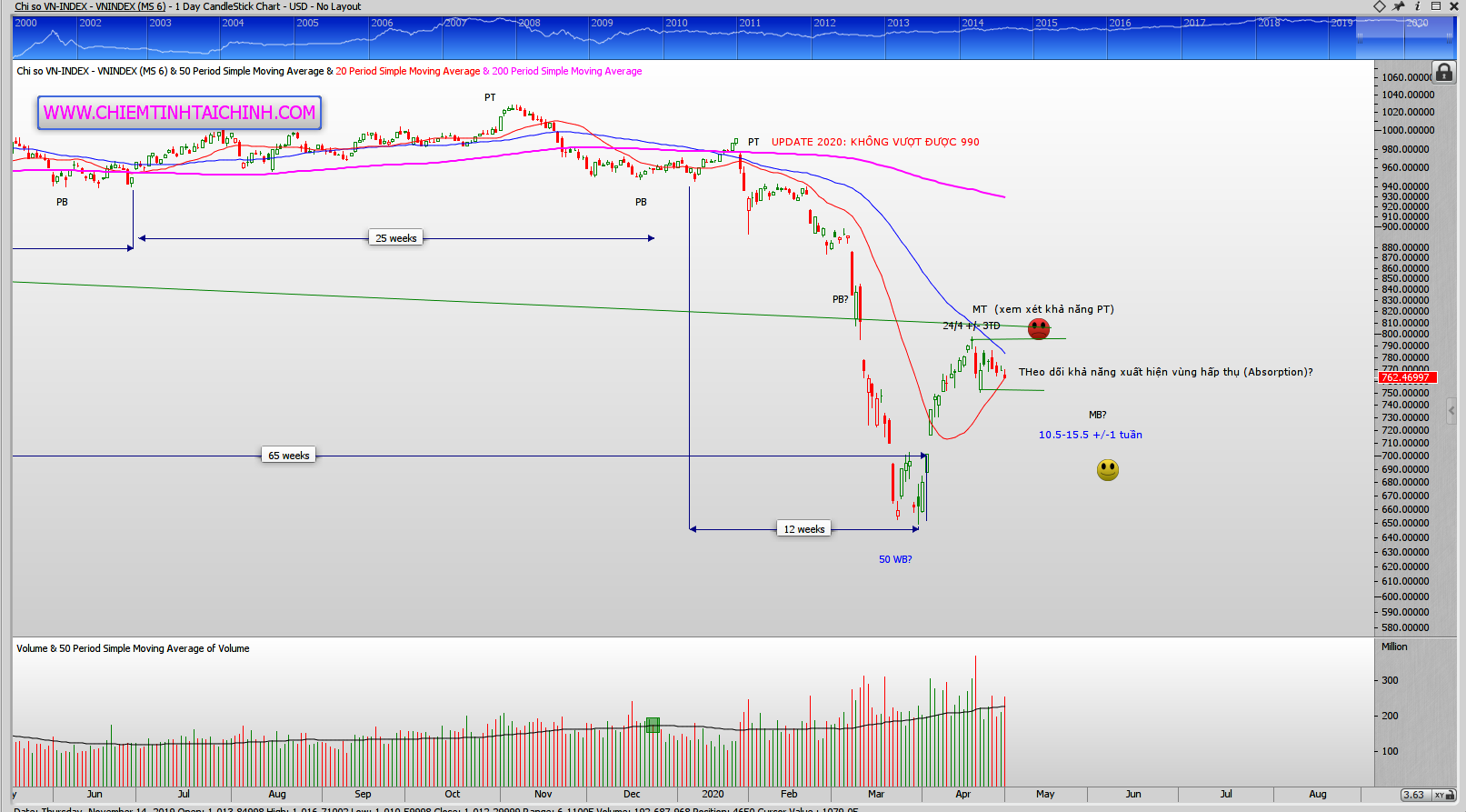 Tuy có 4 ngày phân phối, nhưng chúng tôi đánh giá triển vọng thị trường vẫn là “Xu Hướng Tăng Được Xác Nhận”. Ba trong số bốn ngày phân phối có mức giảm dưới 1%, chỉ riêng ngày 21/4/2020 là giảm trên 3%. Hơn nữa, các ngày phân phối hiện đang diễn ra một range giá từ 750 đến 797. Hiện tại, đáy thấp nhất 750 chưa bị phá thủng và giá đang được đóng cửa đúng tại MA20 ngày.