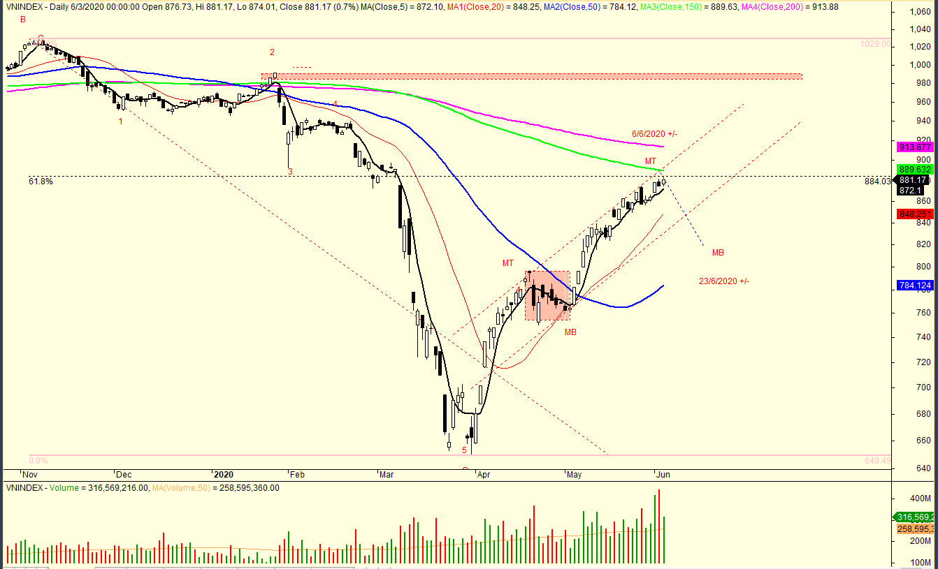 Thị trường tăng điểm nhờ lực đẩy của nhóm ngân hàng như VCB, CTG, HDG, BID. VN-Index tăng 0.73% với khối lượng thấp hơn ngày hôm trước. Triển vọng của thị trường vẫn là XU HƯỚNG TĂNG ĐƯỢC XÁC NHẬN với hai ngày phân phối 27/5 và 2/6. Tình hình vẫn không có gì thay đổi so với bản tin ngày hôm qua. Chỉ số VN-Index đang bị chặn bởi Fibo 61.8% và MA150 ngày, trong khi ngày đảo chiều 6.6.2020 +/-3 ngày giao dịch gây bởi hiện tượng nguyệt thực nửa tối đang cận kề. Chúng tôi đang theo dõi khả năng thiết lập đỉnh của MT hoặc thậm chí PT.