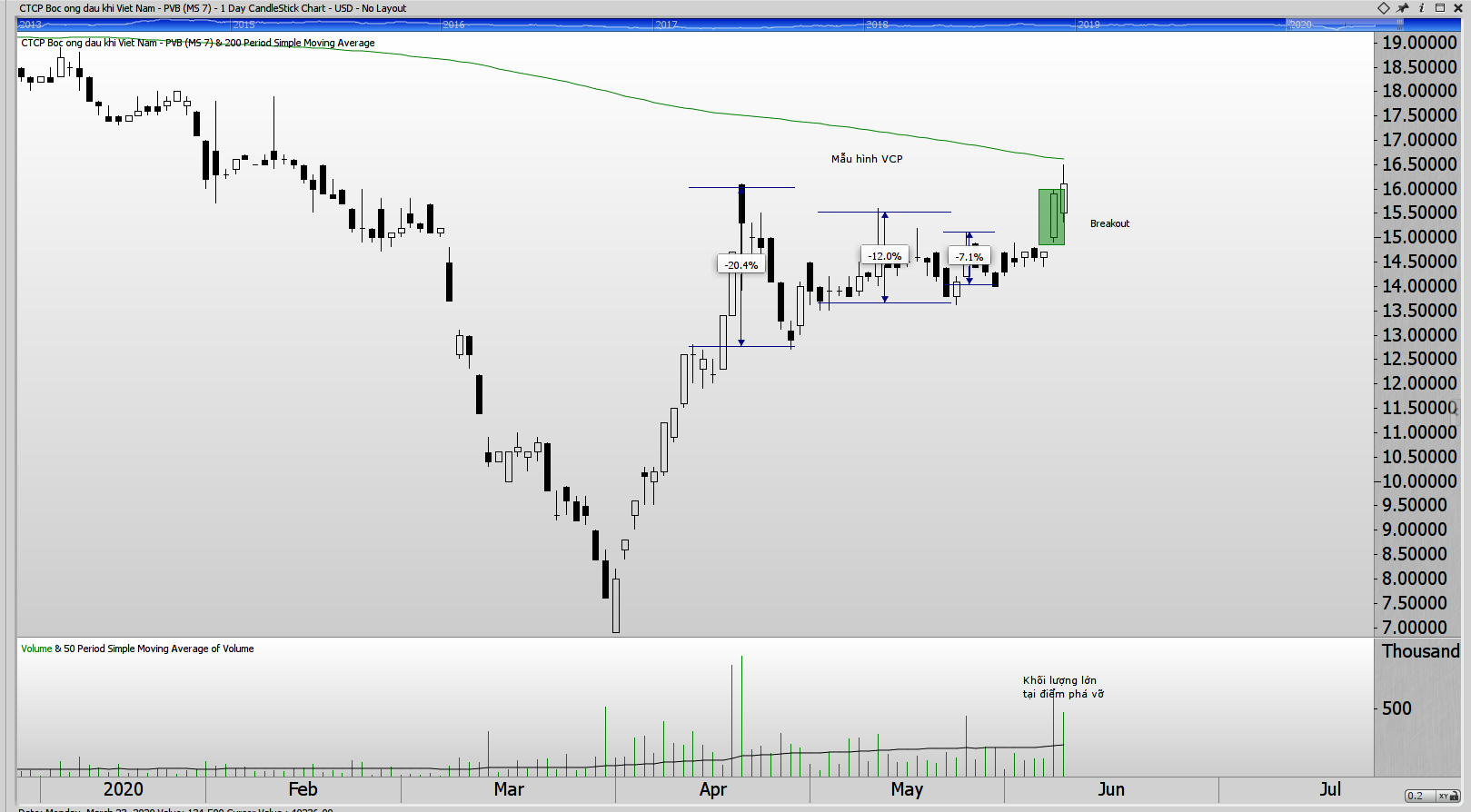 Tiêu điểm ngày hôm nay là cổ phiếu PVB đang xuất hiện mẫu hình VCP của phù thủy Mark Minervini. Điểm breakout xuất hiện và đang bị chặn bởi MA200 ngày.