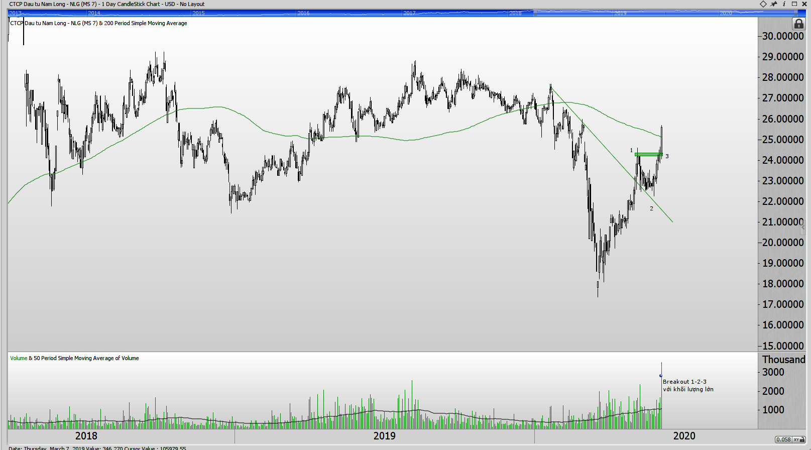 Tiêu điểm của chúng tôi là NLG khi có điểm breakout mô hình 1-2-3. Điểm breakout này xảy ra sau tín hiệu mua Pocket Pivot, một kỹ thuật của Trend Trader vào ngày 4/6/2020. NLG có RS bằng 56, chưa đủ tiêu chí CANSLIM. Bằng kỳ thuật Pocket Pivot, chúng ta đang có điểm mua sớm hơn phương pháp CANSLIM truyền thống.