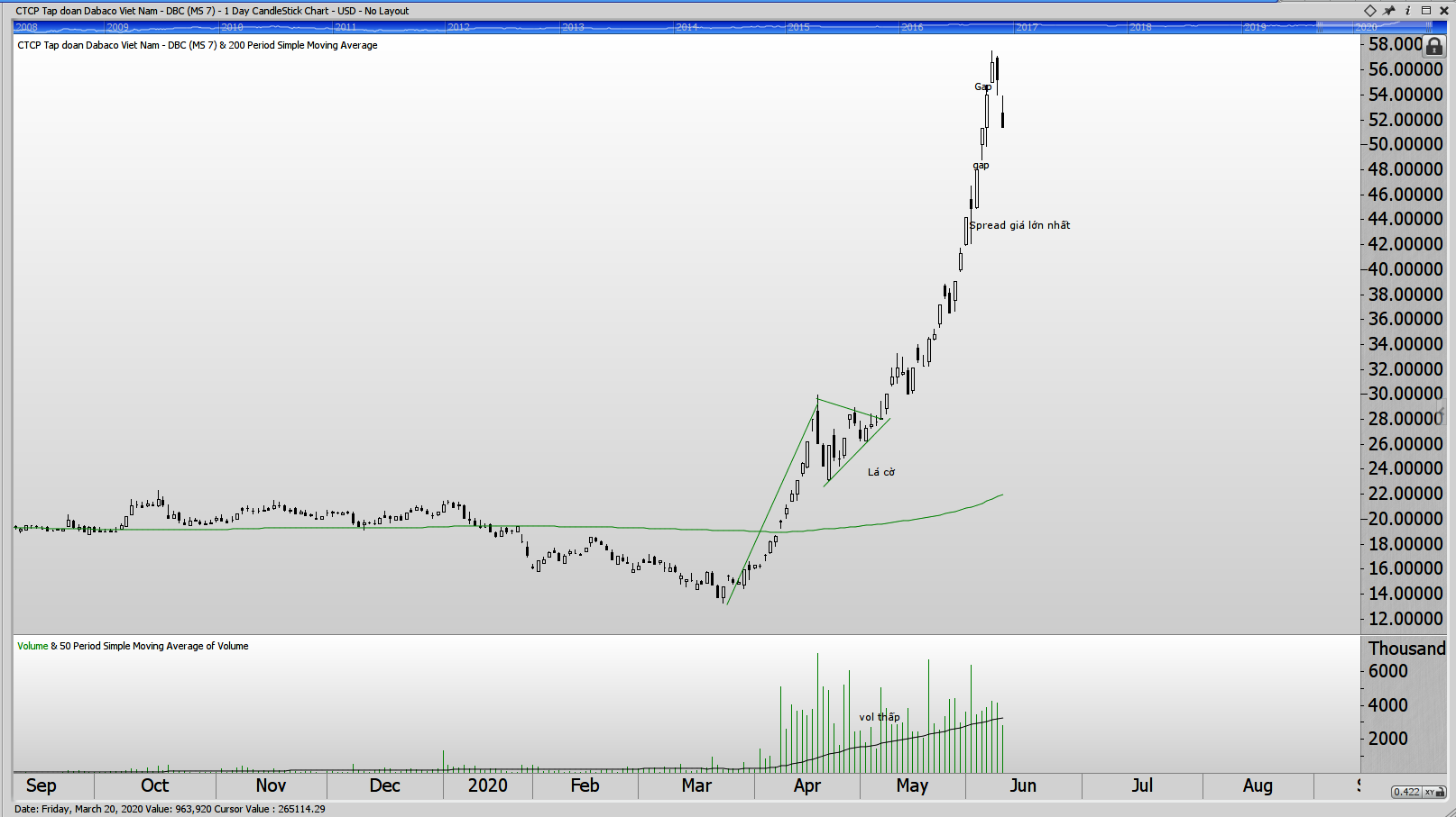 Cổ phiếu DBC giảm sàn sau khi có các dấu hiệu đỉnh cao trào như Gap, Spread rộng nhất.