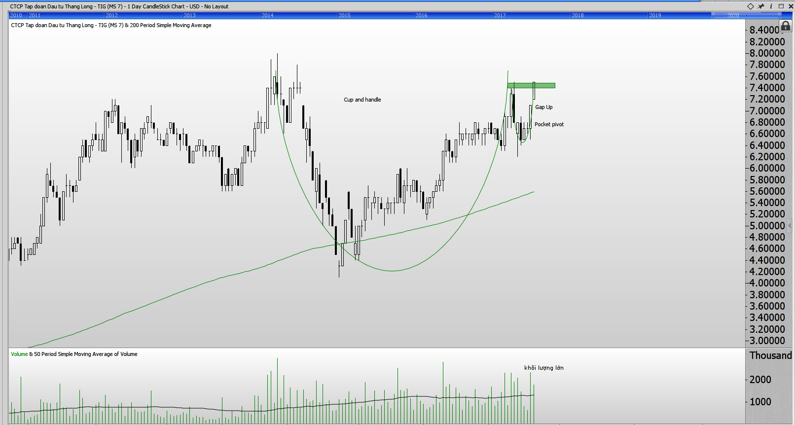 Một cổ phiếu bất động sản có tín hiệu mua Gap Up sau Pocket Pivot là TIG. Cổ phiếu này đang có mẫu hình Cup and handle và chờ phiên breakout.