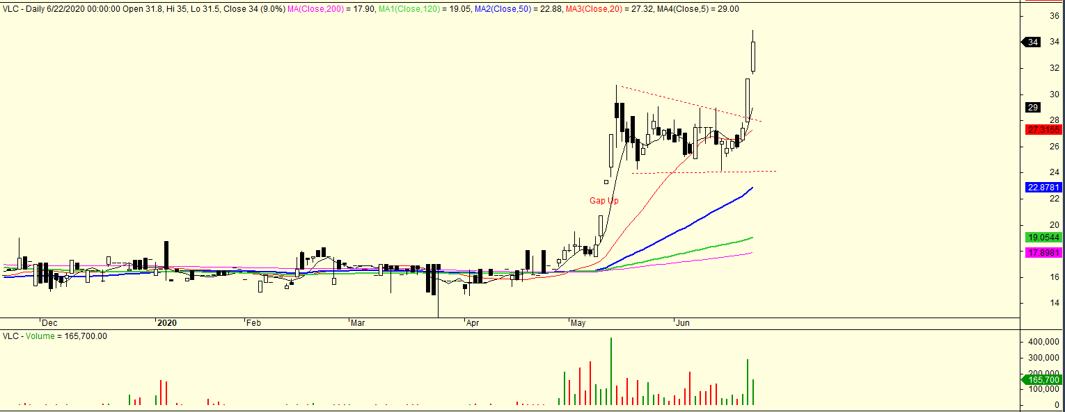 Tiêu điểm tuần này là cổ phiếu VLC (Tổng Công ty Chăn Nuôi Việt Nam). Ngày 19/6/2020, VLC có điểm breakout của mẫu hình lá cờ Flag của Canslim. Cột cờ tăng 137% trong hai tháng, sau đó lá cờ điều chỉnh 20% với khối lượng thấp. Chú ý có khoảng trống tăng giá ở phía cột cờ cho thấy lực tăng mạnh mẽ.