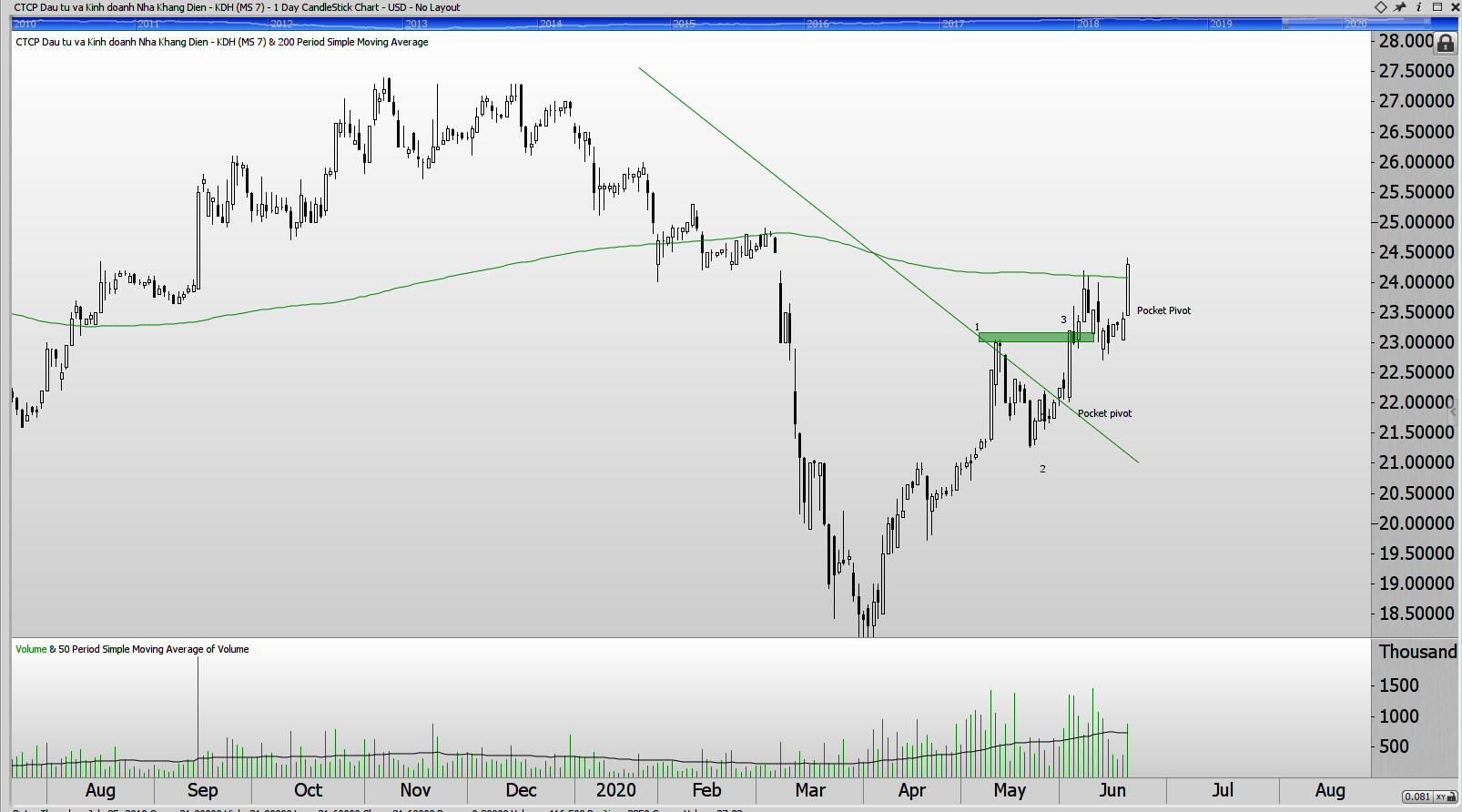 Một số cổ phiếu bất động sản vẫn tăng giá tốt. Ví dụ như NLG, KDH mà chúng tôi đề cập. KDH tiếp tăng sau khi hình thành mẫu hình Breakout 1-2-3, và điểm mua Pocket Pivot, một kỹ thuật mua sớm của Trend Trader.