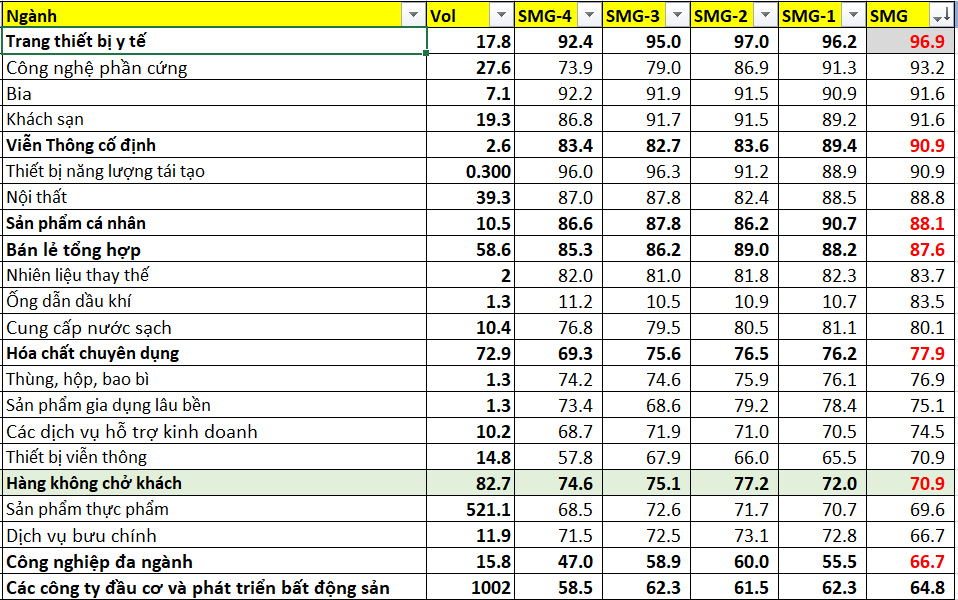 Một số leader đang hoạt động tốt. Theo dữ liệu RS (sức mạnh giá theo nhóm ngành) được gửi vào Trend Trader, nhóm ngành công nghệ phần cứng đang tăng mạnh. Phân chia theo dữ liệu ngành cấp 4 của fireant. Đúng đầu là nhóm trang thiết bị y tế. Trong các nhóm ngành có thanh khoản lớn, chúng tôi lưu ý nhóm Bất Động Sản đang có RS tăng dần theo từng tuần.