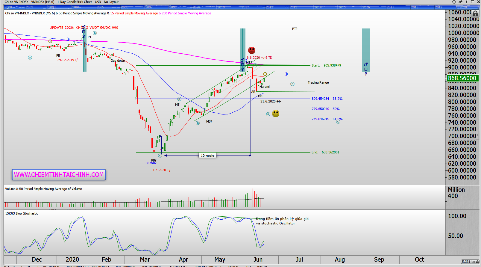 Chỉ số VN-Index tăng điểm trong phiên cuối tuần và vẫn chỉ có ba ngày phân phối nên triển vọng được duy trì : “Xu Hướng Tăng Được Xác Nhận”. Phiên tăng điểm cuối tuần mang tới hy vọng VN-Index tăng điểm trong vài phiên tới. Tôi cần giá vượt qua MA20 ngày để xác nhận kịch bản tăng ngắn hạn này. Thị trường đang tìm cách dò đáy ngắn hạn quanh ngày nhật thực 21.6.2020 +/- như kỳ vọng (xem thêm tại đây).