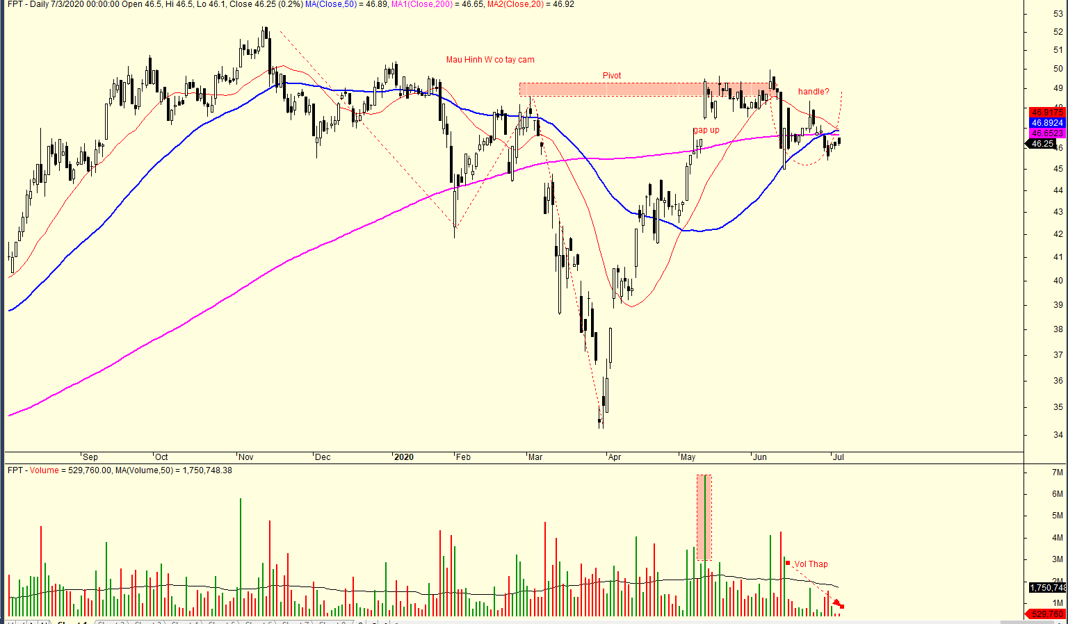 FPT cũng đang loanh quanh MA50 ngày với khối lượng thấp. Mẫu hình W đang được theo dõi.