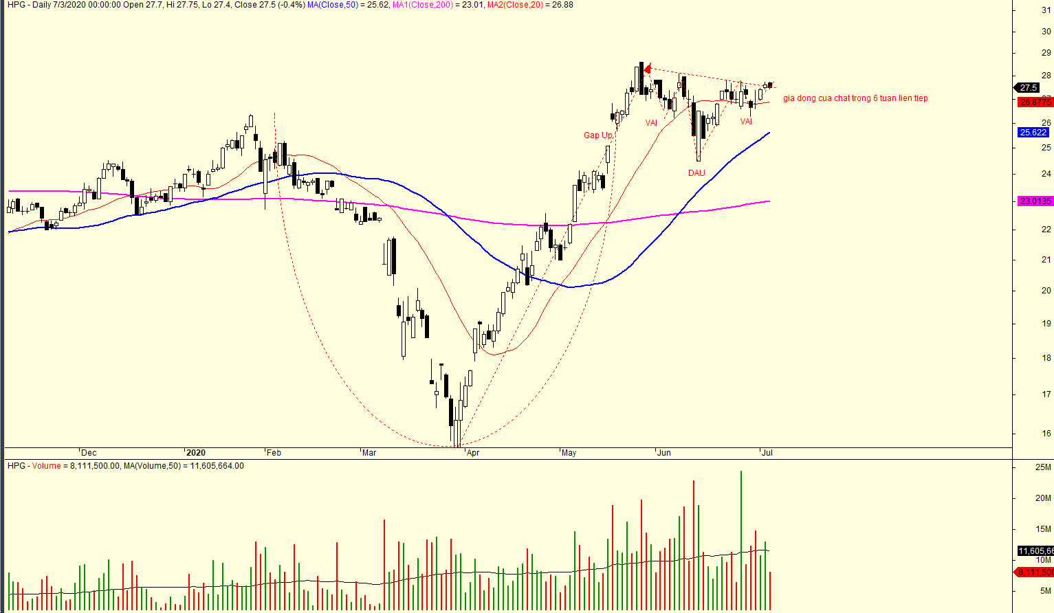 Vì ngành thép đang có RS cao nhất hiện tại nên tôi theo dõi các cổ phiếu trong ngành thép với tiêu điểm là HPG. HPG đang có mẫu hình vai đầu vai củng cố xu hướng. RS =88. Danh sách các cổ phiếu có RS cao được gửi vào Room của Trend Trader. Theo ước tính của công ty chứng khoán KB Securities, lợi nhuận quý 2 ước đạt 2,700 tỷ, tăng 32% so với cùng kỳ năm ngoái. Đây là thông tin được chia sẻ tại đại hội cổ đông vào ngày 26/6/2020. trong đó, lợi nhuận từ mảng thép đạt khoảng 2100 tỉ đồng (tăng trưởng 16.5% yoy) và lợi nhuận của mảng nông nghiệp tiếp tục tăng trưởng đột biến lên mức 500 tỉ đồng (gấp 30 lần so với cùng kỳ năm trước). Lũy kế 6 tháng đầu năm, lợi nhuận sau thuế của HPG ước đạt 5000 tỉ đồng, tăng trưởng 29.5% và hoàn thành 56% kế hoạch. Lũy kế sản lượng thép xây dựng tiêu thụ 6 tháng đầu năm dự kiến sẽ đạt khoảng 1.52 triệu tấn, tăng trưởng 13% yoy và bằng 42% kế hoạch cả năm 2020.
