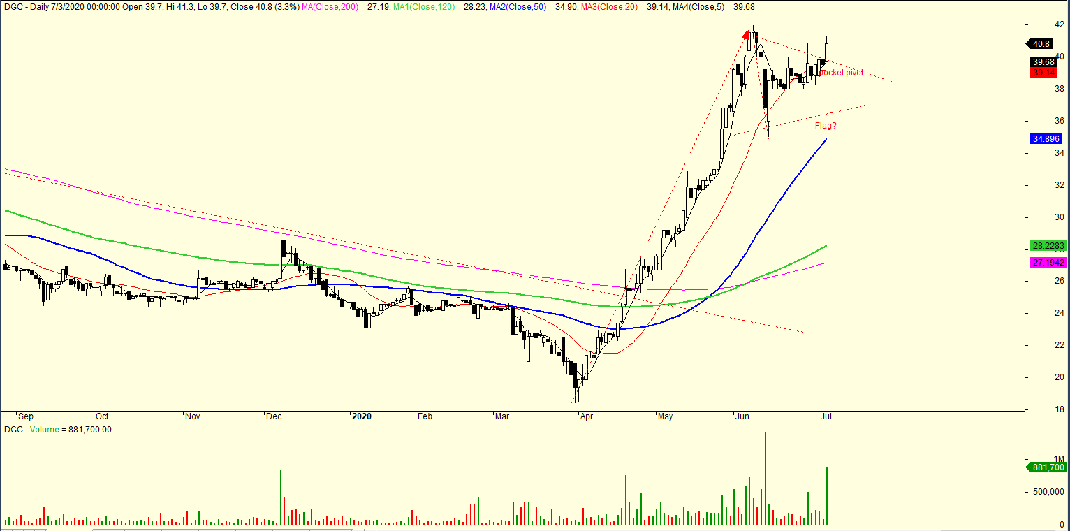Cổ phiếu DGC tiếp tục có điểm breakout mẫu hình Lá Cờ. Xem lại bình luận DGC