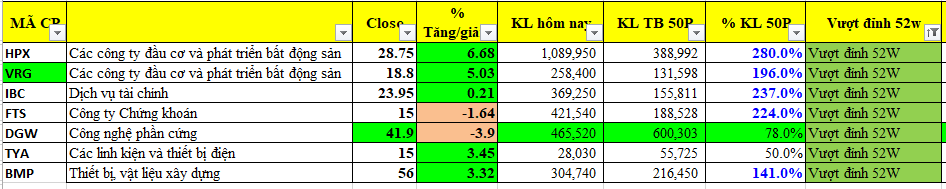 Số lượng cổ phiếu nằm trên MA50 ngày và trên 100 ngày đang tiếp tục cao hơn so với số lượng cổ phiếu nằm dưới các đường trung bình di động trên. Danh sách các cổ phiếu vượt đỉnh 52 tuần đang có dấu hiệu mở rông trở lại. Đây là dấu hiệu của Uptrend (tất nhiên vẫn chờ xác nhận của FTD).